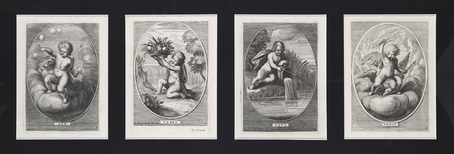 Dekorative Graphik - Ansichten – Für die Motive vgl. Hollstein V.105.14-17. - Gestochen von Frederik de Wit nach Abraham van Diepenbeeck. - Frederik de Wit war ein erfolgreicher niederländischer Kartenverleger des 17. Jahrhunderts, der durch die Produktion auch für die breite Masse erschwinglicher Atlanten bekannt wurde. Die Motive entstanden nach Abraham van Diepenbeeck einem vielseitigen Künstler des Barock, welcher als Maler, Glasgestalter und Druckgrafiker eng mit Rubens zusammenarbeitete und vor allem in Antwerpen wirkte. - Seit der Antike diente die Vier-Elemente-Lehre mit den Grundsubstanzen Feuer, Wasser, Erde und Luft in verschiedenen Disziplinen als Erklärungsmodell für den Aufbau der Welt, bevor sie im Zuge der Aufklärung durch das moderne naturwissenschaftliche Elementverständnis ersetzt wurde, das Elemente als chemisch unteilbare Stoffe definiert und im Periodensystem systematisiert.