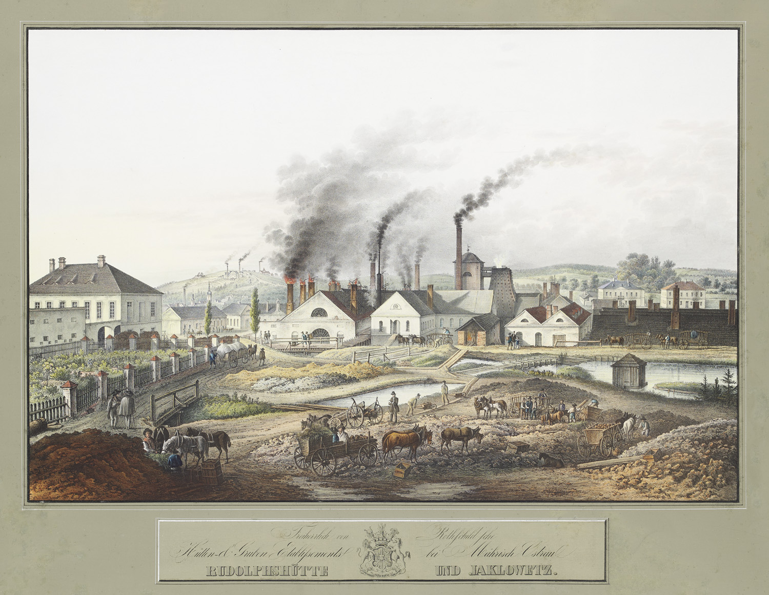 Freiherrlich von Rothschild'sche Hütten und Gruben Etablissements bei Mährisch- Ostrau, Rudoplphshütte und Laklowetz I. 1850. Gouachemalerei über Lithographie. 30 x 44 cm (48 x 61 cm). Unter Passepartout und hinter Glas gerahmt (ungeöffnet).