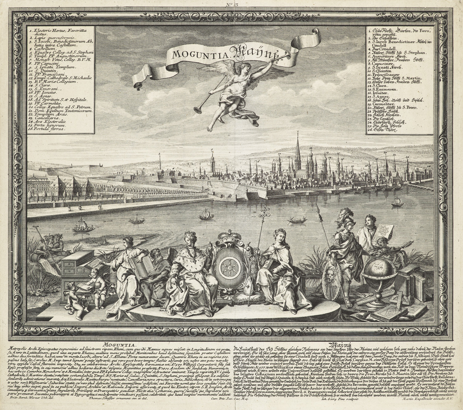 Prints and Engravings - Views – Copperplate engraving on laid paper. Engraved by Johann Georg Pinz after a drawing by F. B. Werner. Printed by Martin Engelbrecht. The title of the view is in a fluttering ribbon at the top margin, with bilingual captions in the two upper corners. The view across the Main River shows Mainz from the Electoral Garden to the Electoral Palace. Allegorical figures are in the foreground. Trimmed to the platemark. Centerfold and slightly creased. Overall, a magnificent copperplate engraving, rich in contrast and rich in detail.