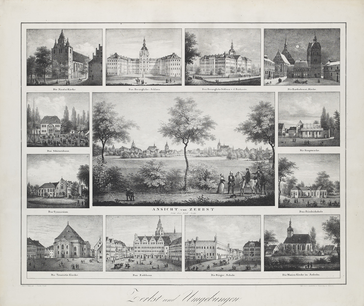 Prints and Engravings - Views – Mid-19th century. Lithograph on wove paper. - Souvenir sheet drawn from nature by lithographer Gustav Frank and printed at the lithographic institute of Goedsche and Steinmetz in Meissen. Shows a larger view of Zerbst from the south side and 12 smaller views of sights in the region. - Edges browned. Slightly creased and minimally stained. Overall in good condition.