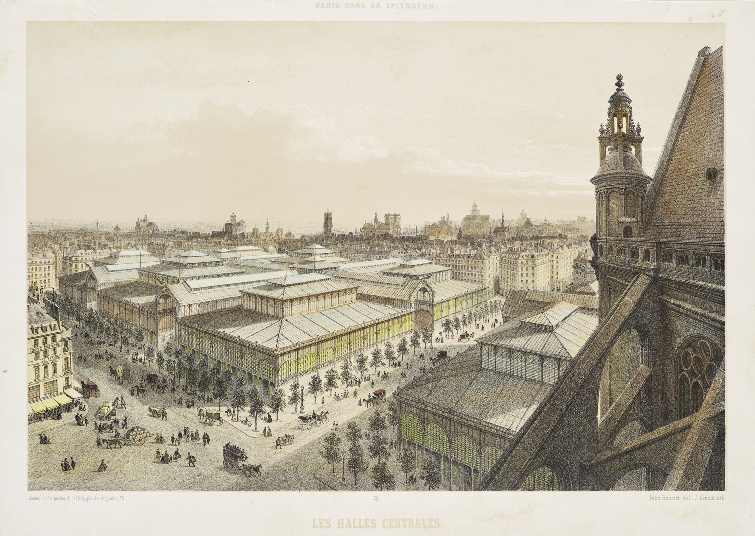 Dekorative Graphik - Ansichten – Enthält: I. Paris moderne. Les Tuileries, le Louvre, et la rue de Rivoli, vue prise du Jardin des Tuileries. 1850. - II. Les Halles Centrales. (Vue prise des galeries de l'Eglise St. Eustache). Um 1860. - III. Vue générale du Palais-Royal. Um 1860. (voll auf Unterlage kaschiert). - Papierbedingt etw. angebräunt u. tls. etw. fleckig sowie braunfleckig, vereinzelt leicht knickspurig u. mit kl. Einrissen. 1 Bl. im linken Rand mit Feuchtigkeitsfleck (Motiv nicht betroffen). Insgesamt wohlerhalten.