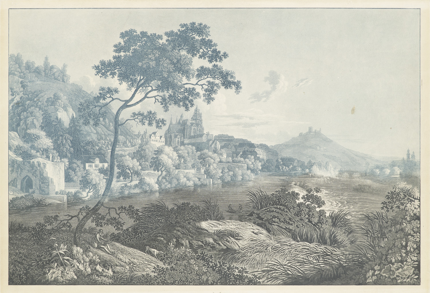 Prints and Engravings - Views – Aquatint printed in black and blue on wove paper. - Proof print for a sheet from the series "Eighteen Views of the Lahn." - Reinerman was born in Wetzlar, then spent some time in Frankfurt am Main and Rome for his education. He later moved back to Wetzlar, where he created his series of engravings depicting views of the Lahn. - Margins browned, small tears. Minimal staining. Overall, a magnificent and well-preserved print.