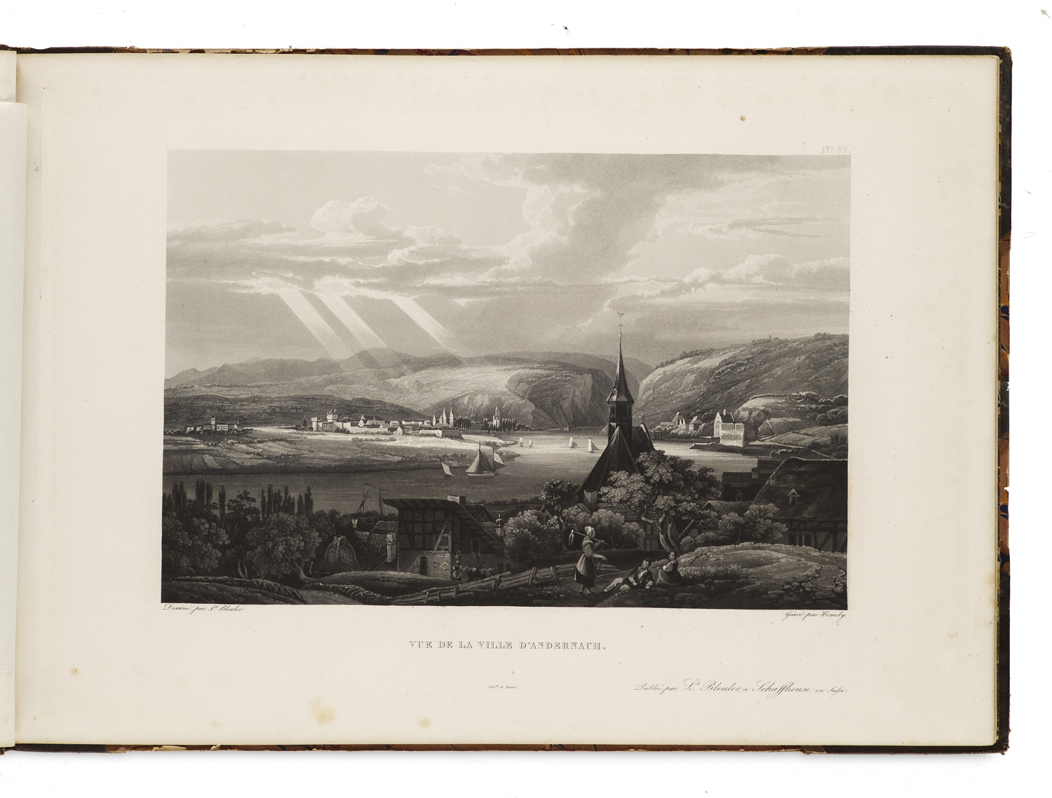 Prints and Engravings - Views – Album with a collection of 14 views of the Rhine. Aquatint on wove paper. Contemp. half leather (chafed). - Decorative views of Andernach (2), Neuwied, Stolzenfels Castle, Marksbourg Castle, Boppart, Goarshausen, Lorelei, Oberwesel, Kaub, Bacharach, Rheinstein Castle, Bingen, and Rüdesheim. - Outer margins partially slightly foxed (first sheet heavier).