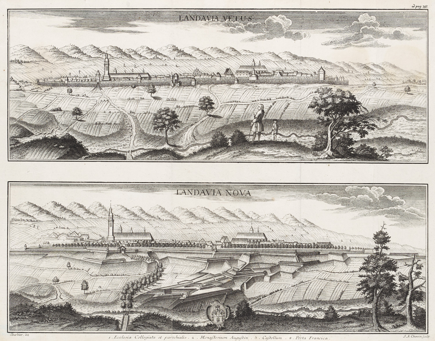 Landavia Vetus - Landavia Nova. 2 Kupferstich Ansichten von Landau auf einem Blatt. Um 1760. Auf Bütten. Motiv je 16,5 x 45 cm, Blattmaße 38,4 x 52 cm. Unterhalb der Darstellung mit gestoch. Bezeichnung sowie Legende.