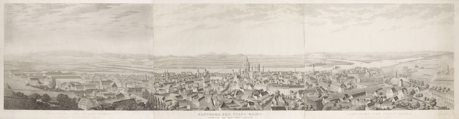 Panorama der Stadt Mainz. Aquatinta-Ansicht auf 3 Blättern. Mannheim, 1822. Je ca. 58 x 71-76 cm, ca. insg. 50,5 x 220 cm. Unter Plexiglas gerahmt.