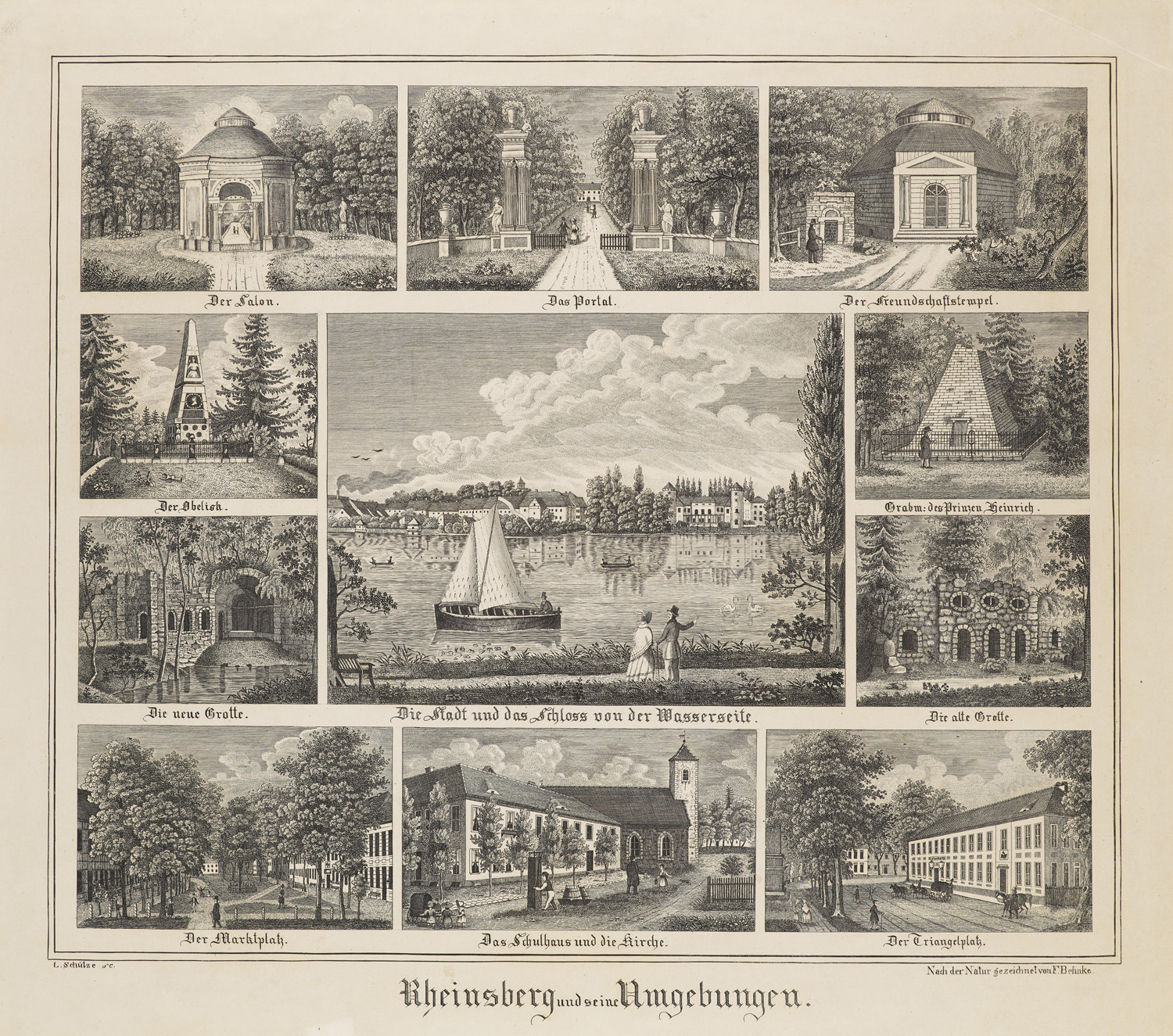 Dekorative Graphik - Ansichten – Souvenirblatt von Rheinsberg und der Umgebung, gezeichnet von F. Behnke und gestochen von L. Schütze. Mittig eine größere Ansicht von Rheinsberg und dem Schloss von der Wasserseite, umgeben von 10 kleineren Ansichten von Sehenswürdigkeiten der Region. - Rand gebräunt. Insgesamt sehr gut erhaltener, detailreicher und feinliniger Stich.