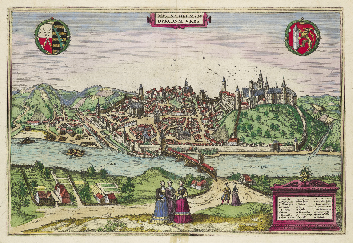 Misena Hermundurorum Urbs. Handkolorierte Kupferstichkarte. Von Franz Hogenberg, nach Georg Braun, um 1575. 32,6 x 48,6 cm (41,5 x 54,5 cm).