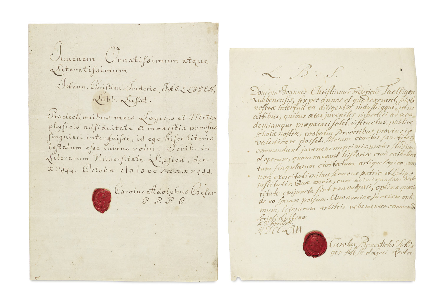 Sammlung von Zeugnissen, Dissertationsschriften u.a. Dokumenten aus dem Nachlass von Johann Christian Friedrich Fälligen aus Lübben zu seiner Zeit als Student an der Universität Leipzig etc. Um 1780-1791. Versch. Formate.