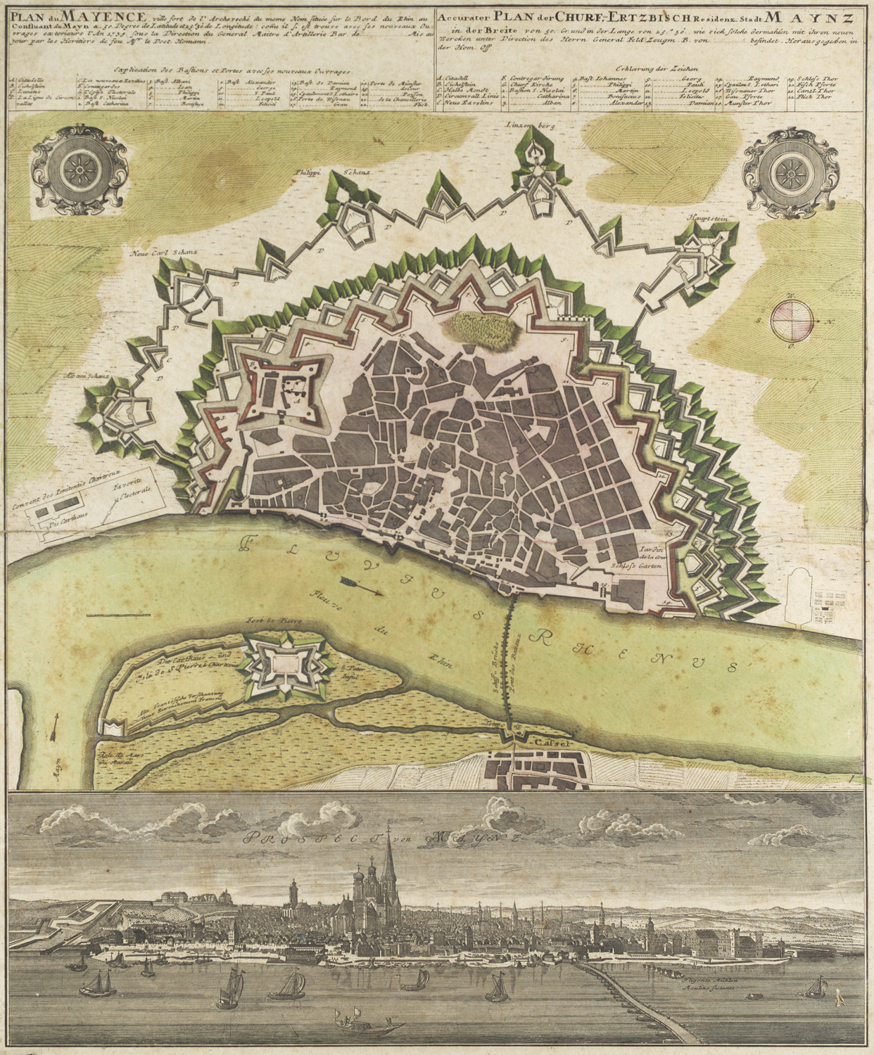 Plan du Mayence. Accurater Plan der Churf.- Ertzbisch Residenz Stadt Maynz. Altkolorierter Kupferstich auf Papier. Nürnberg, Homanns Erben, 1735. Sichtmaß 60 x 50 cm. Unter Glas gerahmt (ungeöffnet).