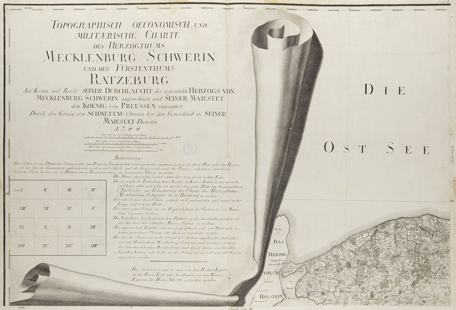 Orts- und Landeskunde mit verschiedenen Schlagworten – Dörflinger S. 107f. - Lex. Kart. S. 710 - IKAR: Berlin M 20945. - Monumentale und überaus detaillierte topographische Karte des Herzogtums Mecklenburg-Schwerin und seiner Provinzen zum Ende des 18. Jahrhunderts. - Die Kartenblätter wurden von I. Alberti, C. Jaeck (Sektion 10 u. 13) u. C. F. Gürsch (Sektion 6) gestochen. - Mit ausführlicher Legende auf Sektion 4, welche verschiedene Grenzen, Wälder, unterschieden nach Baumarten, trockene und feuchte Wiesen, Heidekrautbewuchs, Wasser- und Windmühlen, Schleusen u.a. auflistet. - 1. Bl. mit Stempel "Kön: Bergwerks Bibliothek". - Kanten etwas berieben, Ränder teils bestioßen, teils etwas braunfleckig.