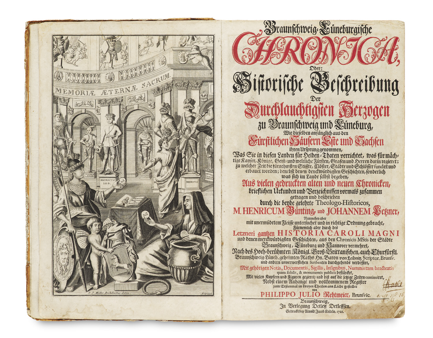 Braunschweig-Lüneburgische Chronica, Oder: Historische Beschreibung Der Durchlauchtigsten Herzogen... aus den Fürstlichen Häusern Este und Sachsen... durch M. Henricum Bünting, und Johannem Letzner, Nunmehro aber... biß auf die jetzige Zeiten continuiret... von Philippo Julio Rehtmeier. 1., 2. u. 3 Teil (bis inkl. Kap. LXXIII) in 2 Bänden. Mit gestochenem Frontispiz von G. Uhlich nach J. J. Müller, 27 (v. 65) Kupfertafeln, 2 Textkupfern und zahlreichen Textfiguren, Vignetten und Initialen im Holzschnitt. Braunschweig, Detleffsen, 1722. 6 Bl. (Front., Tit., Widm.), 32 S., 4 Bl. (Inhaltsverz.), 680 (recte 656) S. u. 2 Bl. (Zwischentit., Inhaltsver.), S. 681-1376. 2°. Hldr. d. Zt. goldgeprägt. dekor. RTit. und umseitigen Rotschnitt (bestoßen, beschabt und berieben).