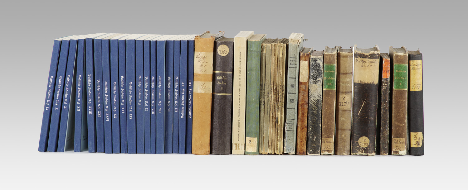 Umfangreiche Sammlung von über 100 Heften, sowie 2 Registern und einem Inhaltsverzeichnis der Baltischen Studien. Hrsg. von der Gesellschaft für Pommersche Geschichte und Altertumskunde. Mit zahlreichen Abbildungen, Tafeln und Karten. 1832-1964.