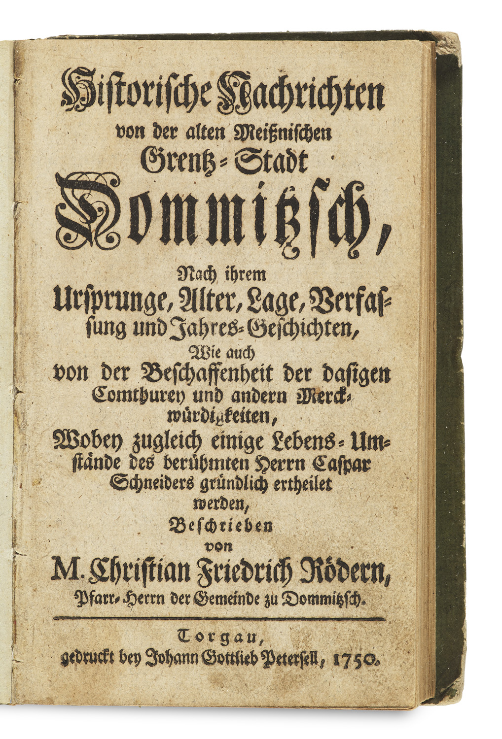 Historische Nachrichten von der alten Meißnischen Grentz-Stadt Dommitzsch, Nach ihrem Ursprunge, Alter, Lage, Verfassung und Jahres-Geschichten, Wie auch von der Beschaffenheit der dasigen Comthurey und andern Merckwürdigkeiten, Wobey zugleich einige Lebens-Umstände des berühmten Herrn Caspar Schneiders gründlich ertheilet werden. Torgau, Petersell, 1750. 7 Bll., 393 S. Ppbd. d. Zt. (etwas beschabt).