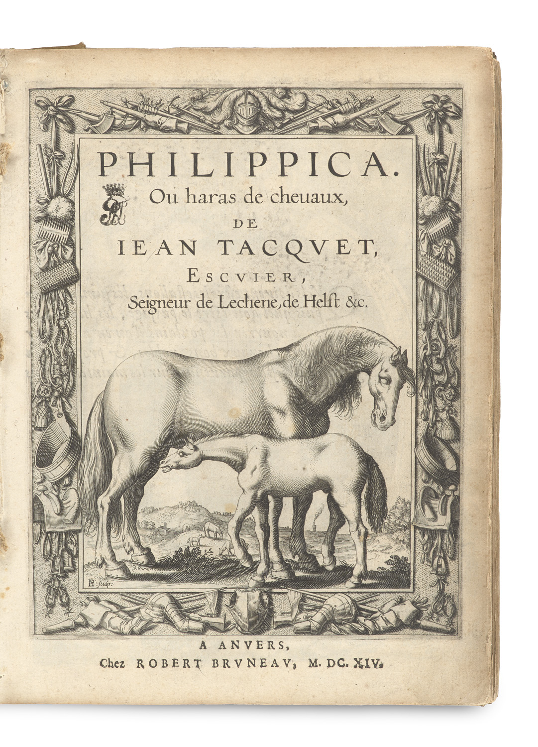 Philippica. Ou haras de cheuaux de Iean Tacquet, Escvier, Seigneur de Lechene, de Helft etc. Mit illustr. Titelbl. in Kupferradierung von Cornelius Bol (sign. "BL"), 1 (v. 4) Taf. mit Porträt d. Verf. in Kupferradierung, sowie einigen Vign. u. mit Rankenwerk ausgefüllten Initialen im Holzschnitt. Anvers, Bruneau, 1614. 276 S. 4 Bl. (Index, Nachr., Errata, Priv.) Sign. A-Z4, Aa-Mm4, Nn2. 4°. Flex. Pgmt. d. Zt. mit goldgeprägt. Wappensupralibri auf beiden Decken und fragm. Schließbändern (Hs. RTit. durch überklebtes u. entfertes Schild beschädigt, Rücken verfärbt, etwas aufgewellt).