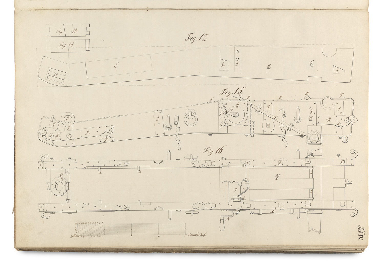 Manuscripts – Report of the journey to Germany by royal and supreme command. German manuscript in brown ink by a legible hand on laid paper with watermark. With some text illustrations and 13 finely executed manuscript plates with ink drawings. Signed and dated by Mechlenburg after his preface. Contemp. cardboard (soiled, rubbed, corners bumped, small losses to covers). - Finely executed, unpublished manuscript (or early copy) by the Danish artillery officer Ezechias Gustav von Mechlenburg (1742-1804) about a three-month journey to Germany to study the artillery of various German states and to reform and improve the Danish-Norwegian artillery and fortifications. On his journey he visited Leipzig, Brunswick, Wittenberg, Dresden, Magdeburg, Zorgau, Potsdam and Berlin and became friends with Gerhard von Scharnhorst. The manuscript is divided into four parts: 1. the organisation of the artillery system in Saxony. - 2. news of the Austrian artillery.- 3. news of the Prussian artillery.- 4. news of the Brunswick artillery.- The plates numbered from I to XII. show in fine detail all types of German artillery.- Mechlenburg became adjutant general to King Christian VII in 1776 and accompanied the Prussian campaign against Austria in 1778. In 1788 he commanded the artillery in the war against Sweden as lieutenant colonel, and in 1792 he was given command of the entire artillery corps. He taught at the artillery cadet school, carried out experiments with various guns and corresponded with Scharnhorst on technical matters relating to artillery. In 1801 he led a command in the war against Great Britain, after which he became major general and commander of the Frederikstad fortress. - A manuscript on Mechlenburg's ballistic experiments can be found in the Prussian State Archives (GStA PK VI HA NI Scharnhorst, no. 193 fol. 2-38). - First page with old stamp of a royal artillery library. - Margins occ. somewhat foxed and fingerstained, otherwise well preserved.