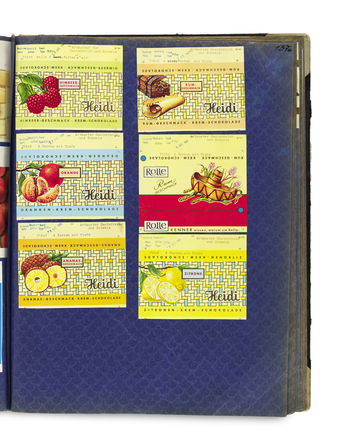 Varia and Miscellaneous – Collection of approx. 560 mostly chromolithographic samples for chocolate wrappers. Mounted in contemp. album (rubbed, small defects in the cover). - Contains mainly patterns for Christmas and Easter chocolates, as well as for fruit bars, cream chocolates. - Mostly stamped ('Serre', 'Emmerich Tager, Rauch & L. Haiber', 'N. Bähr', etc.), partially with date stamps and stamped or handwritten information on colours and chocolate factories (Krapf & Arnold, Imhoff, etc.). - Some with mostly minor damage, overall good condition.