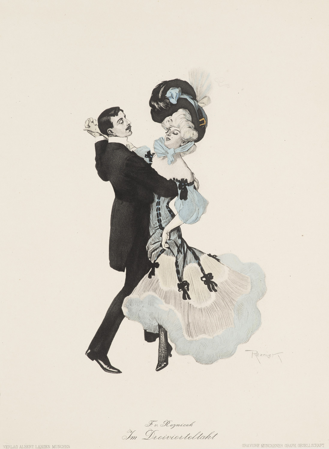 Varia and Miscellaneous – Dance - Six dance pictures in copperplate print coloured by hand. In orig. folder with coloured paper cover and mounted title (browned, bumped, spine with small losses). - Very charming and fine work in the well known Reznicek style.