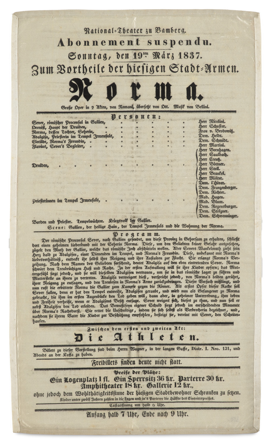 National-Theater zu Bamberg. Abonnement suspendu. Sonntag, den 19ten März 1837. Zum Vortheile der hiesigen Stadt-Armen. Norma. Große Oper in 2 Akten, von Romani, übersetzt von Ott. Musik von Bellini. Druck auf naturweißer Seide. Ca. 27 x 22 cm.