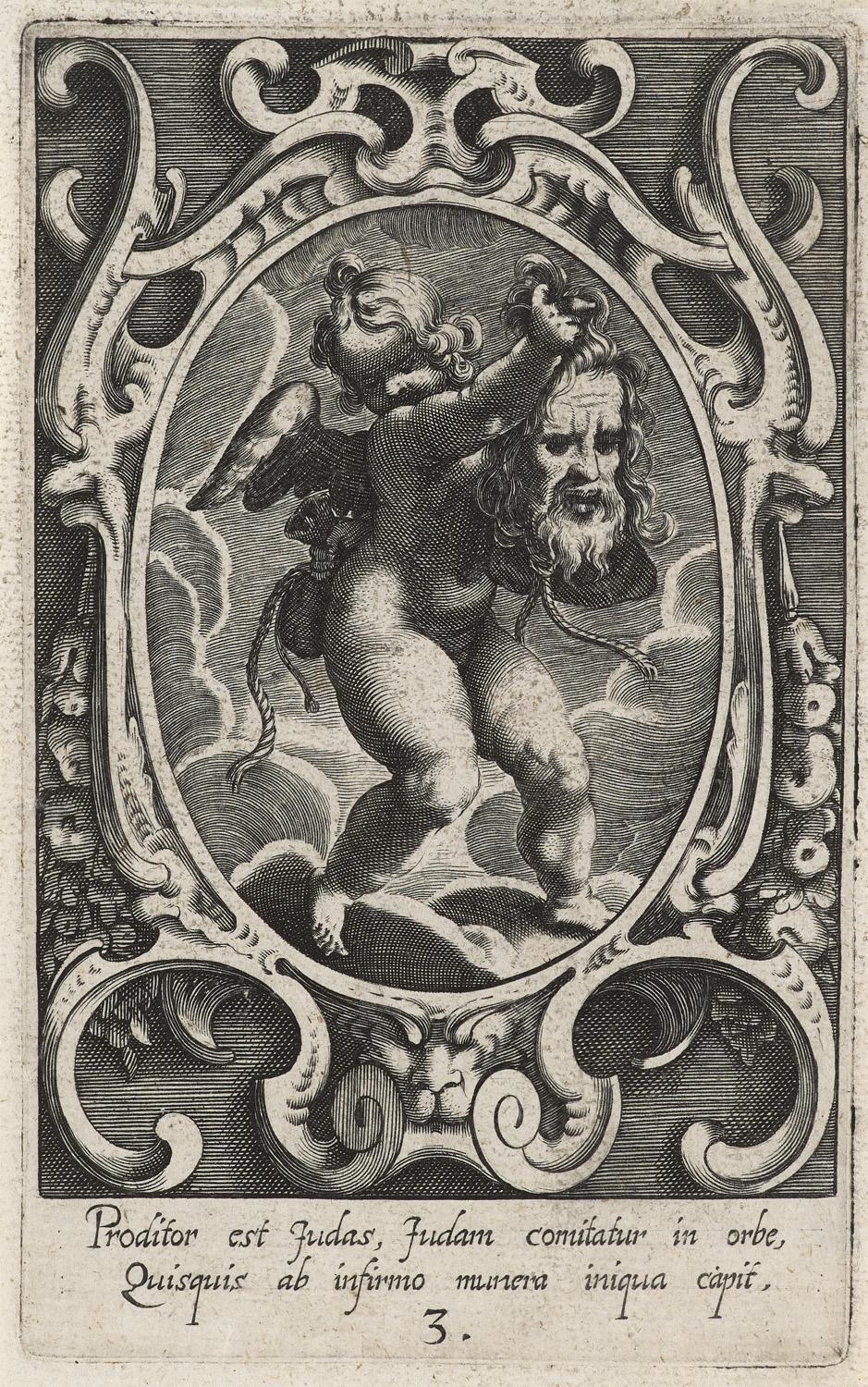 Alte Künstlergraphik – Hollstein, S. 6, 185, 4, Le Blanc 1854 - 1890, S. 2, 78, 1. - Enthält: - Der Kopf des Judas (Blatt 3) - Dornenkrone und Rohrstock (Blatt 5) - Das Schweißtuch der Veronika (Blatt 6) - Kreuz mit Inschrift (Blatt 8) - Werkzeug und Pfeile (Blatt 9) - Würfelnder Engel (Blatt 11). - Die Drucke entstanden von Raphael Custos, welcher der Halbbruder von Lucas Kilian (1579-1637) war und der die Motive entwarf. Zusammen mit Wolfgang Kilian (1581 - 1683) arbeiteten die drei (Halb)brüder kooperierend in ihren Werkstätten zusammen. Sie alle lernten bei dem Vater Domenicus Custos (1560 - 1612). Die Stiche von Raphael Custos zeigen unverkennbar den Stil von Lucas Kilian, der zu den Meistern des sog. Ornamentstiches gehörte und besonders für seine Anwendung von Mauresken und Knorpelornamentformen berühmt wurde. - Aus der 12-teiligen Serie "Emblemata Sacra Passionis Salvatoris nostri Jesu Christi".