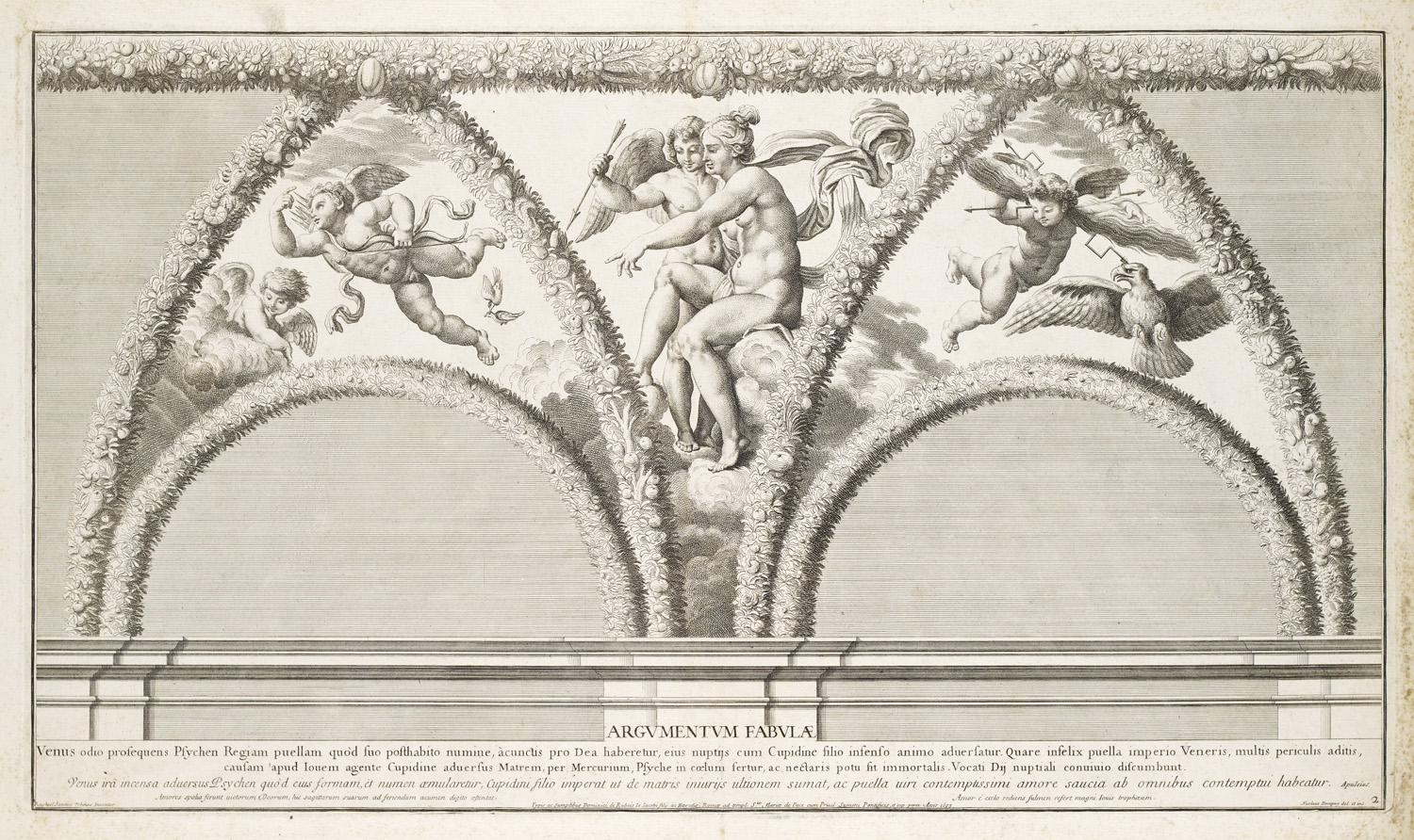 2 Kupferstiche. I. Argumentum Fabulae. Kupferstich auf Bütten. Nicolas Dorigny nach Raffael. Bei Domenico de' Rossi, 1693. 38 x 67 cm (47 x 70,5 cm). - Lünetten aus der Loggia di Psyche, links Cupido, der zwischen den Wolken fliegt, in der Mitte Venus, die mit Cupido an ihrer Seite sitzt, rechts ein Putto, welcher die Blitze Jupiters trägt, begleitet von einem Adler Jupiters. - II. Ansicht von Stenay. Kupferstich von 3 Platten auf festem Bütten. N. Cochin bei Beaulieu. Um 1694. 45,5 x 54,5 cm (49 x 59,5 cm). Mit Zierbordüre sowie prachtvoll figürlich flankiertem Medaillon. Unterhalb der Darstellung mit gestoch. Legende.