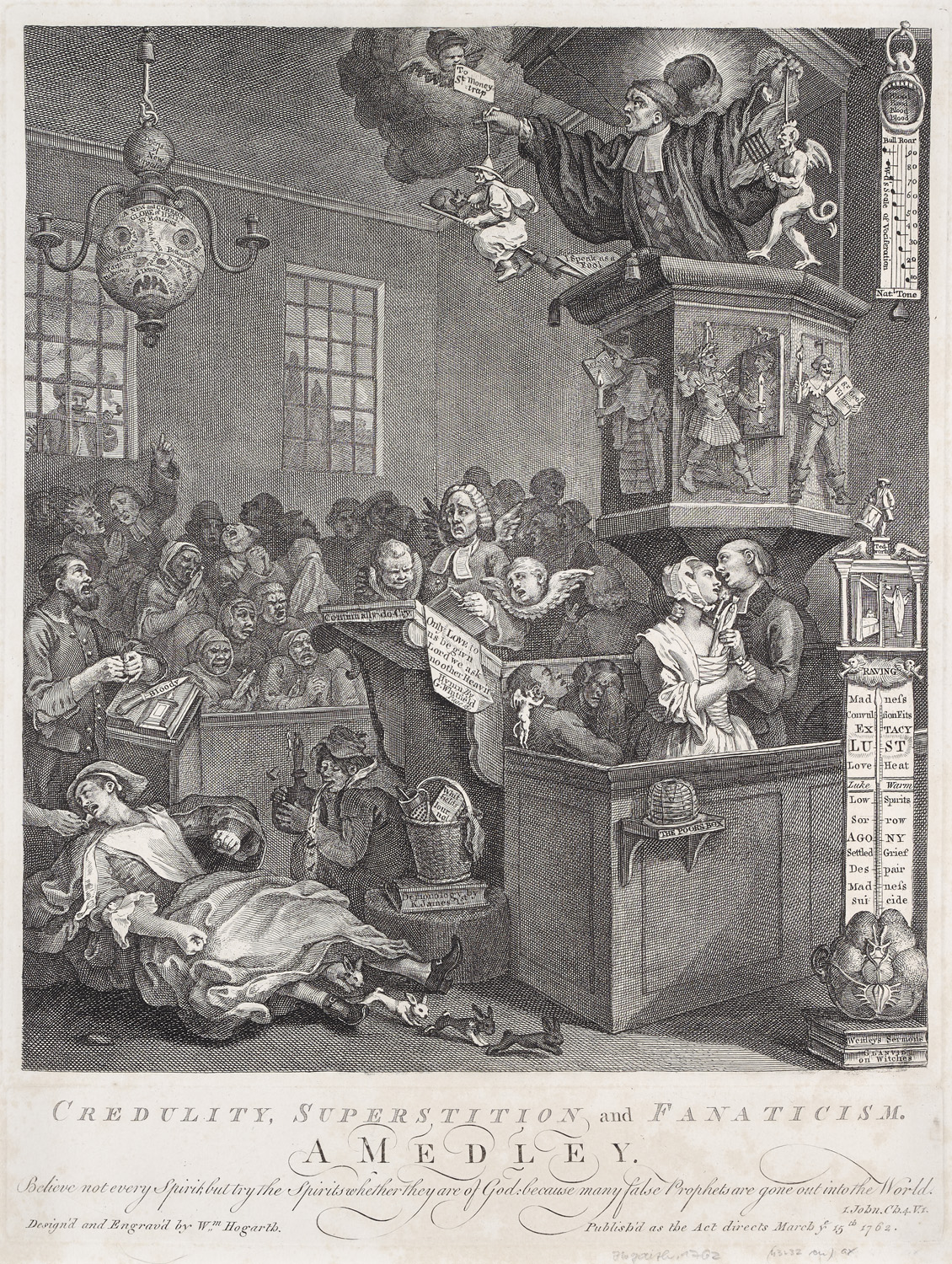 Alte Künstlergraphik – Enthält: A Midnight Modern Conversation. 1733. Kupferstich auf Velin. 35 x 47 cm (39 x 51,5 cm). - A Rake's Progress. Szene II. The Levée. 1735. 36 x 40,5 cm (39 x 44,5 cm). - Credulity, Superstition, and Fanaticism. 1762. 43,5 x 33 cm. - Leicht stockfleckig. Insgesamt alle gut erhalten. - Dabei: Ernst Ludwig Riepenhausen. Nach William Hogarth. A Midnight Modern Conversation. Um 1795. Kolorierter Kupferstich auf Velin. 20,5 x 25,5 cm. - William Hogarth, Serjeant Painter to His Majesty. Nach 1764. 40,5 x 35 cm. Insgesamt gut erhalten.