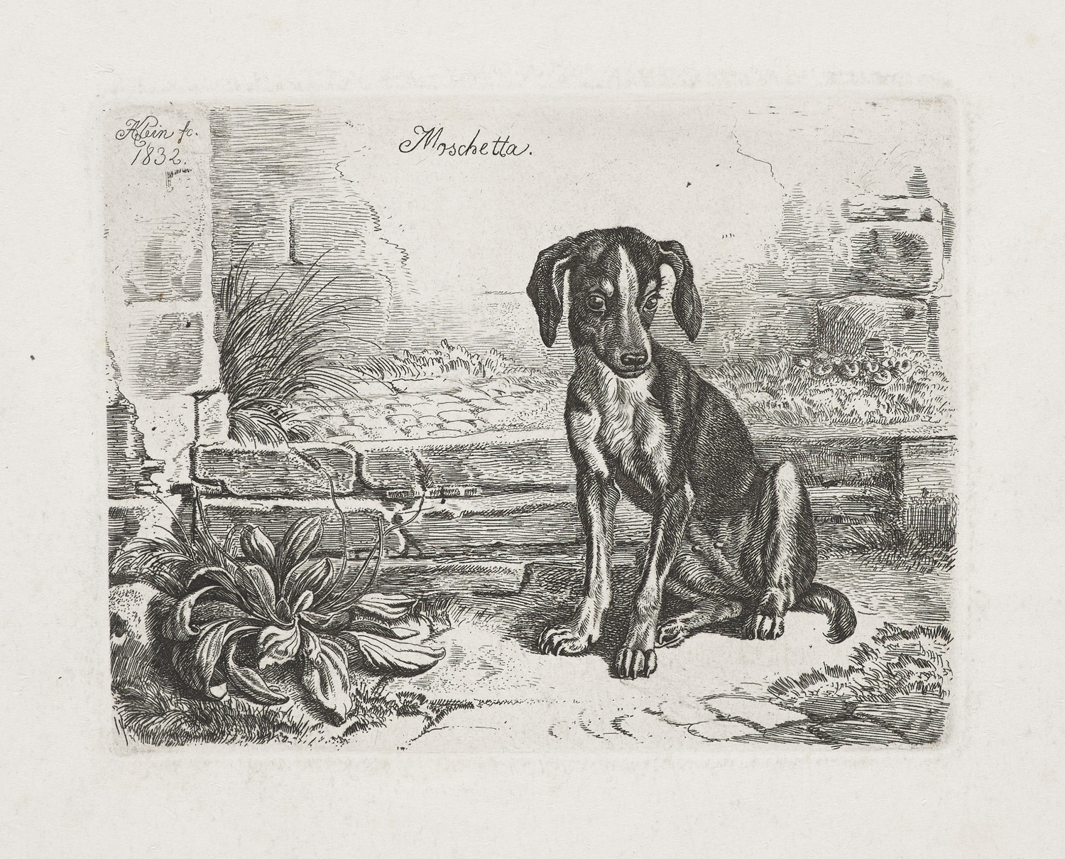 Alte Künstlergraphik – Als Maler und Kupferstecher des Biedermeiers konzentrierte sich Johann Adam Klein auf Genredarstellungen. Während er ab 1816 auch Gemälde produzierte, so sind es eine Druckgraphiken, die durch ihre besondere Qualität überzeugen. Ein großer Teil seiner Genreszenen zeigen Tiere, so auch die vier Radierungen. Sie zeigen die Hunde beim Entspannen, Trinken und in Begegnung mit einer Katze. - Ränder gebräunt und griffspurig, leicht stockfleckig. Radierungen unbeeinträchtigt. Insgesamt sehr gut erhaltene und kontrastreiche Radierungen.
