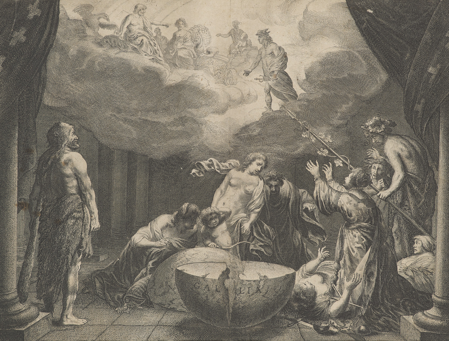 Alte Künstlergraphik – Hollstein Dutch 100 u. 102. - Aus Caspar Barlaeus Werk "Medicea Hospes", welches 1638 in Amsterdam erschien. - Tableau vivant, in dem die französische Jungfrau, dargestellt von Maria de' Medici, die Götter um Hilfe anfleht. Heinrich IV., als Herkules gekleidet, wird beauftragt, das Land wieder zu vereinen. Friede, Amor und Venus blicken bestürzt auf den Globus des in zwei Hälften geteilten französischen Reiches. - Je mit geglättetem Mittelfalz. Etwas knitterig und leicht fleckig. Insgesamt wohlerhalten.