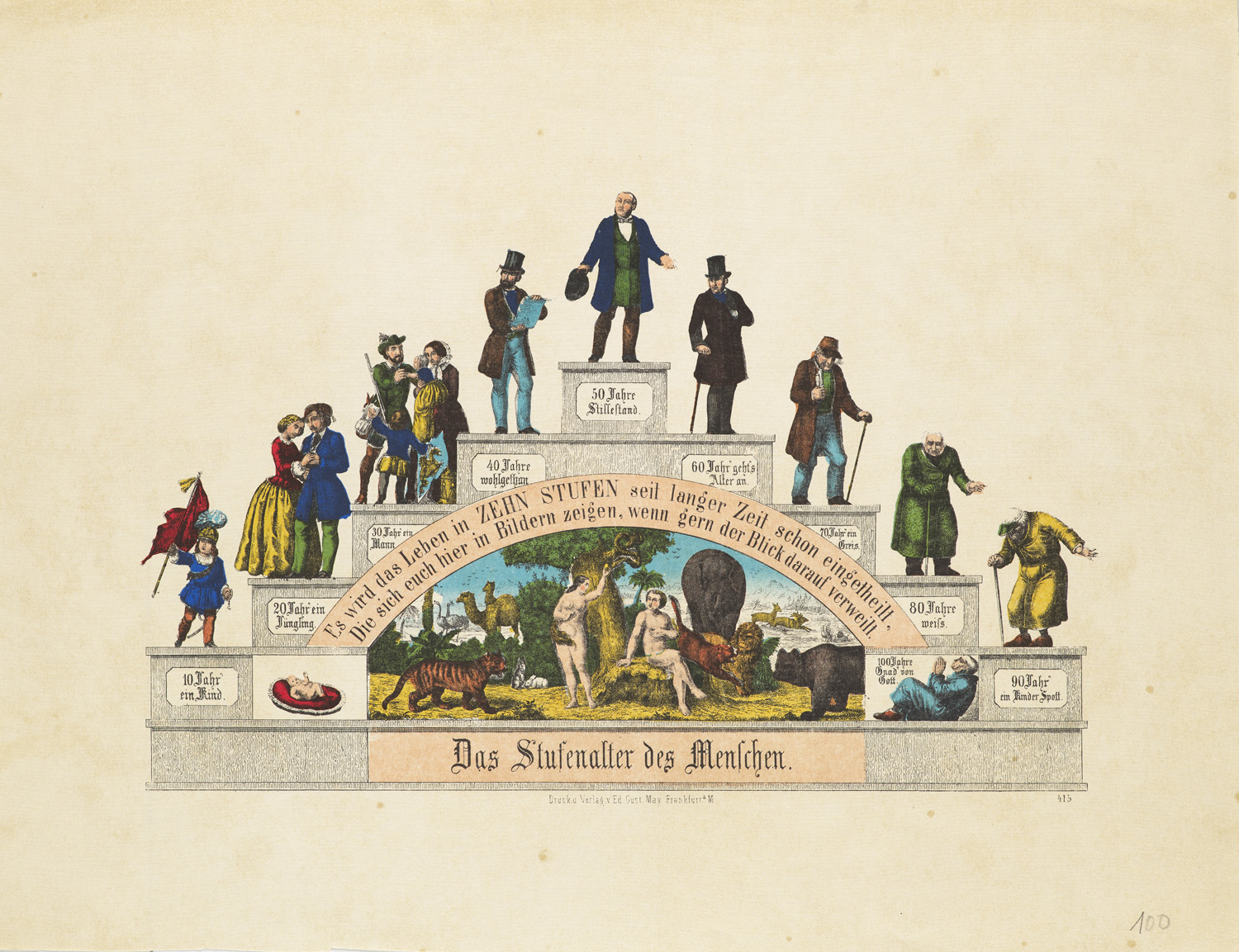 Das Stufenalter des Menschen. Frankfurt a. M. Ed. Gust. May, (Mitte des 19. Jahrhunderts). Kolorierte Lithographie auf Bütten. 32,5 x 42 cm.