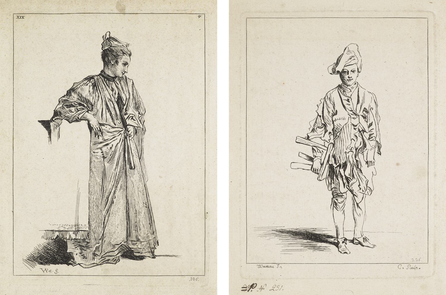 2 Radierungen nach A. Watteau. Um 1720. Radierung auf Bütten. Ca. 24 x 18 cm.