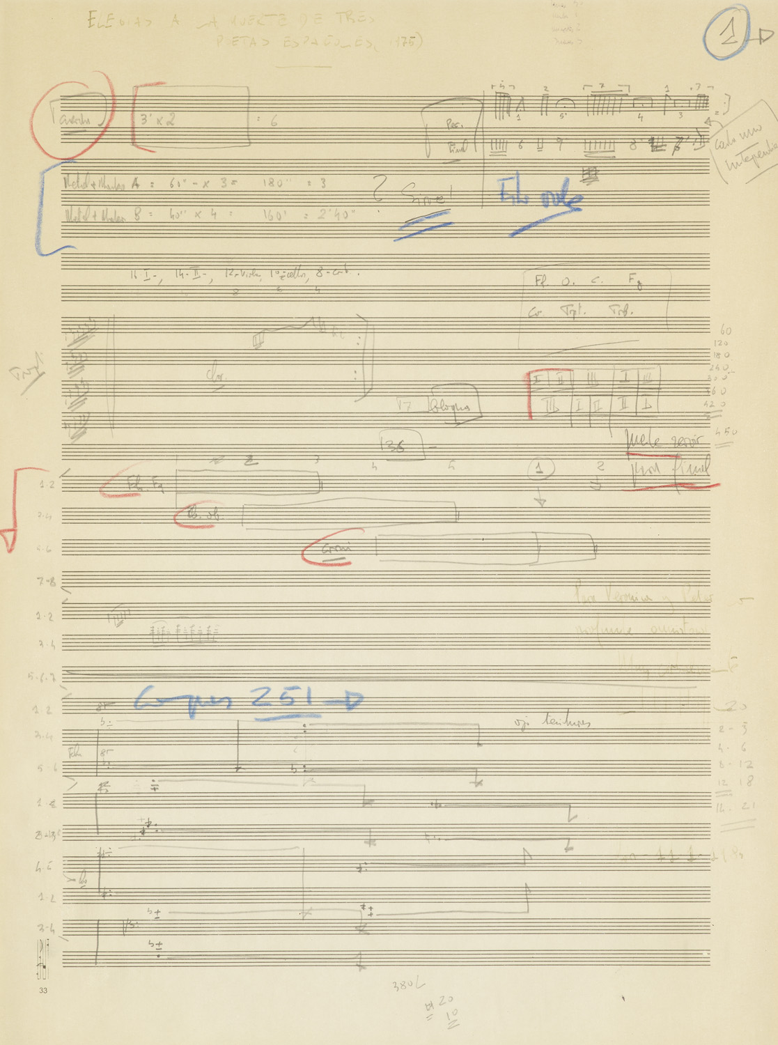 Elegías a la muerte de tres poetas españoles (1975). Eh. Notenblatt des spanischen Komponisten (1930-2021) in Bleistift mit tls. farbigen Anstreichungen u. Zusätzen. 1 S. auf 1 Bl. Unter Passpartout mont. u. unter Glas gerahmt (Passepartoutausschnitt ca. 38 x 28 cm, Rahmen ca. 54,5 x 41,5 cm).
