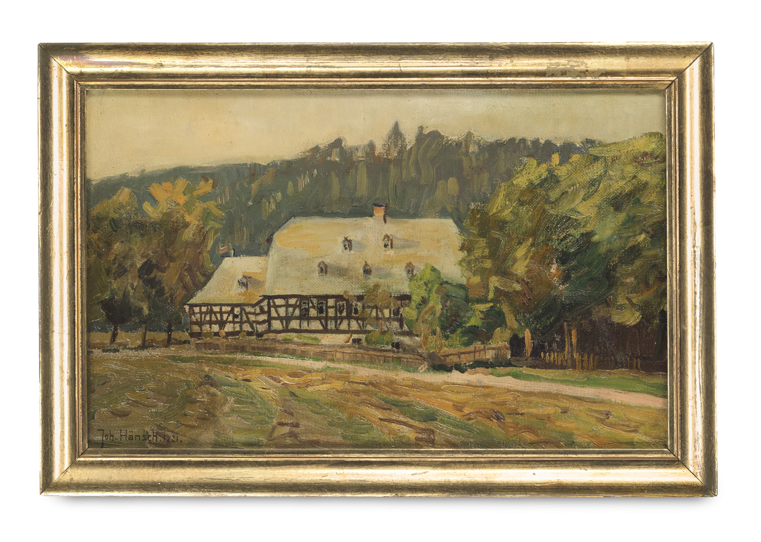 Gemälde, Zeichnungen u. Grafiken 16. bis 19. Jhd. – Nicht mehr bei Maennig. - Wir danken Dr. Barbara Maennig für die freundliche Bestätigung der Authentzität. Provenienz: Privatsammlung Berlin. - An wenigen Stellen Leinwand mit von verso geschlossenen Einrissen, ebd. kleine Retuschen unter UV, Leinwand verso mit Alterungsspuren, insgesamt gut. In frischem Kolorit gehaltene Ansicht eines in die Herbstlandschaft gebetteten Fachwerkhauses.