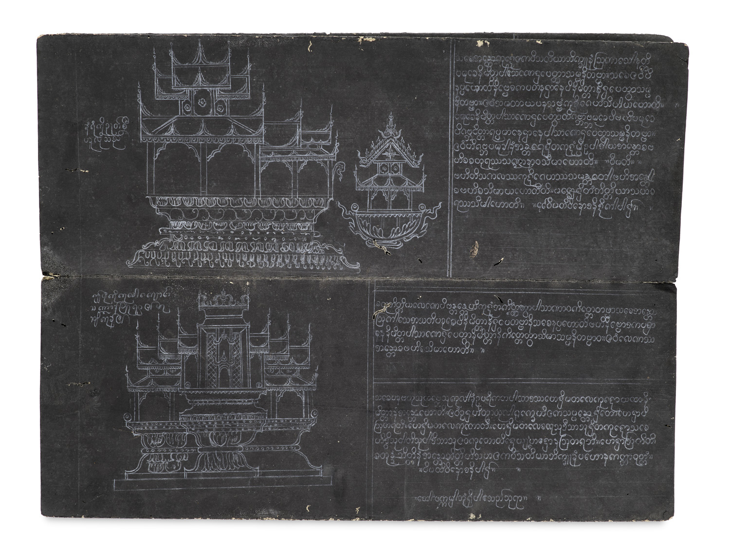 Manuskripte und Urkunden – Darin enthalten sind ritualisierte Texte, die im Theravada-Buddhismus für die Einführung ins Mönchtum verwendet werden. Die Bild- und Textkombination illustrieren häufig architektonische Baupläne, die rituelle Sitzanordnung, religiöse Symbole und zentrale Lehren, um den sakralen Raum kosmologisch korrekt auszugestalten. - Teils etwas wurmstichtig und berieben.