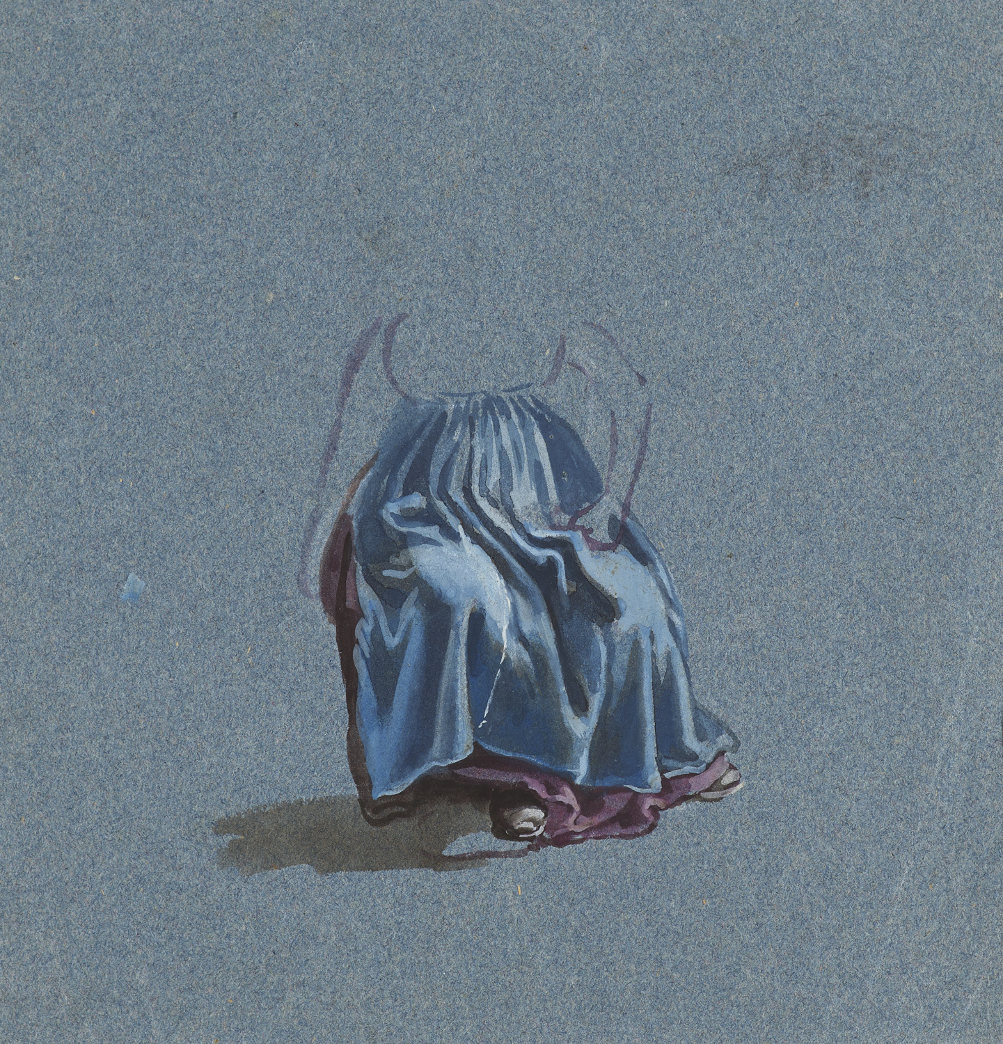 Paintings, drawings and prints 16th to 19th century – Costume study. Watercolour with gouache, accentuated in white, on blue wove paper. Spot-mounted to underlying mat. - Provenance: Private collection, Southern Germany. - Small crease in right margin, on verso with traces of previous mounting. Good overall.