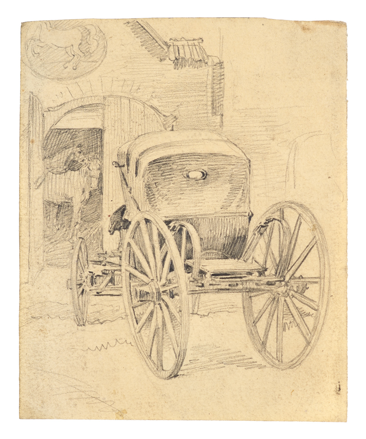 Reisekutsche vor dem Stall. Erste Hälfte 19. Jhdt. Bleistiftzeichnung auf leicht genarbtem Velin. 14 x 11,5 cm. Verso mit weiterer, skizzenartiger Zeichnung. In Punkten auf Unterlage montiert.