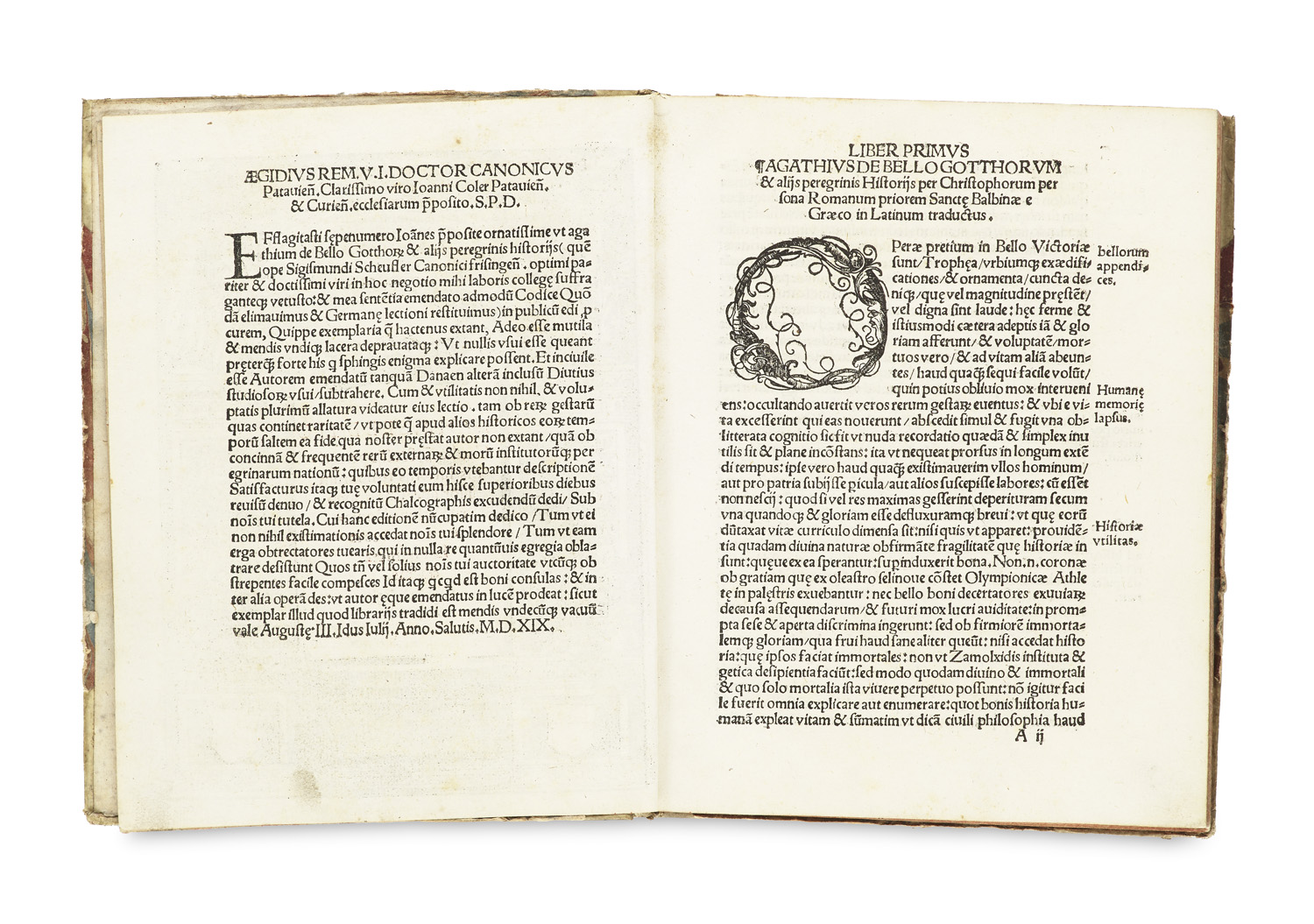 Prints before 1600, Bibles, Classics in Original Languages – Second printed edition of Agathias's late antique "Histories." - For references see above. - The first print, in the Latin translation presented here, of the work originally written in Ancient Greek by the Eastern Roman historian Agathias Scholastikos (c. 531-582) was published in Rome in 1516. - The opulent wood-cut title framing is reproduced in Pflugk-Harttung, plate 14, and, with the present title, in Johnson, plate 23. - Paste-downs and endpapers with heavier staining, some leaves wate-rstained, some leaves occasionally slightly finger-stained. Overall, a well-preserved, collectible copy.