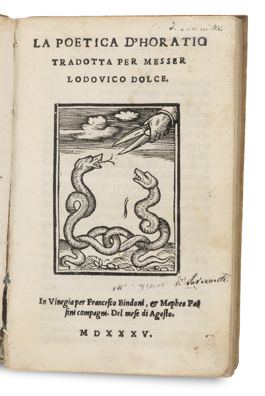 Prints before 1600, Bibles, Classics in Original Languages – Classics. - First edition. - The first edition of the first translation of Horace's Art of Poetry into a vernacular language, together with another rare Dolce edition, the genuine first edition of Stanze. The second book is also a rare edition, the genuine first edition of Dolce's stanzas on the recent African victory of the Most Holy Emperor Charles V, covering the conquest of Tunis in 1535, the successful capture of the city, then under the control of the Ottoman Empire, by the Habsburg Empire of Charles V and its allies. Rare, according to the USTC there are no copies in libraries outside Italy.