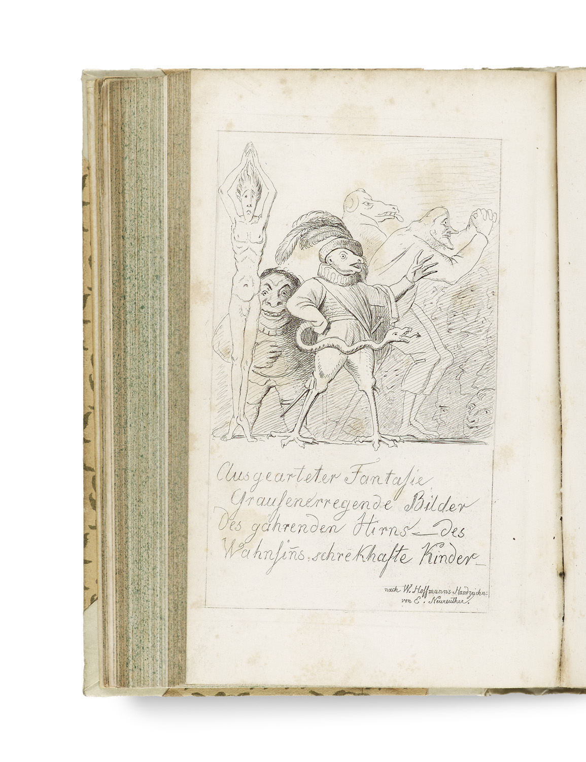 Erzählungen aus seinen letzten Lebensjahren, sein Leben und Nachlaß. Hrsg. von Micheline Hoffmann. 5 Tle. in 2 Bden. Mit 9 Kupfertafeln von Neureuther, Sonderland u. a. nach Hoffmann und 2 gefalt. lithogr. Faksimiles. Stuttgart, Brodhag, 1839. Hprgt. um 1900 mit rotem Rückenschild..