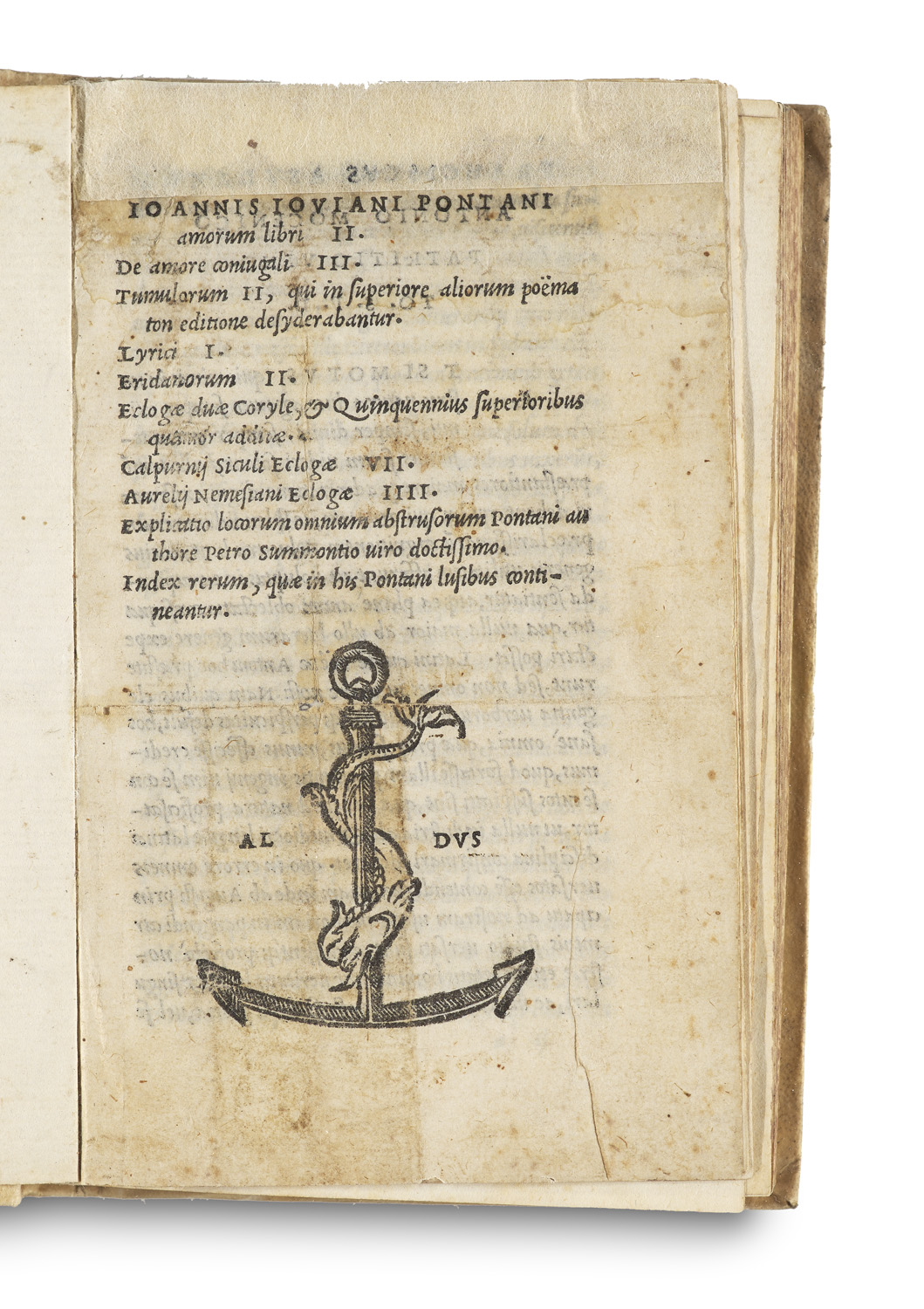 Prints before 1600, Bibles, Classics in Original Languages – Aldine Press. - With repeated woodcut printer's mark on the title and at the end. Cont. vellum with later manuscript spine label. - First and only edition of the Aldus press of Pontanus' love poetry. - Title page with backed loss in white margin, verso with slight loss of letters, and with further backing with adhesive tape, slightly browned and stained, book block broken, sporadic cont. marginalia.