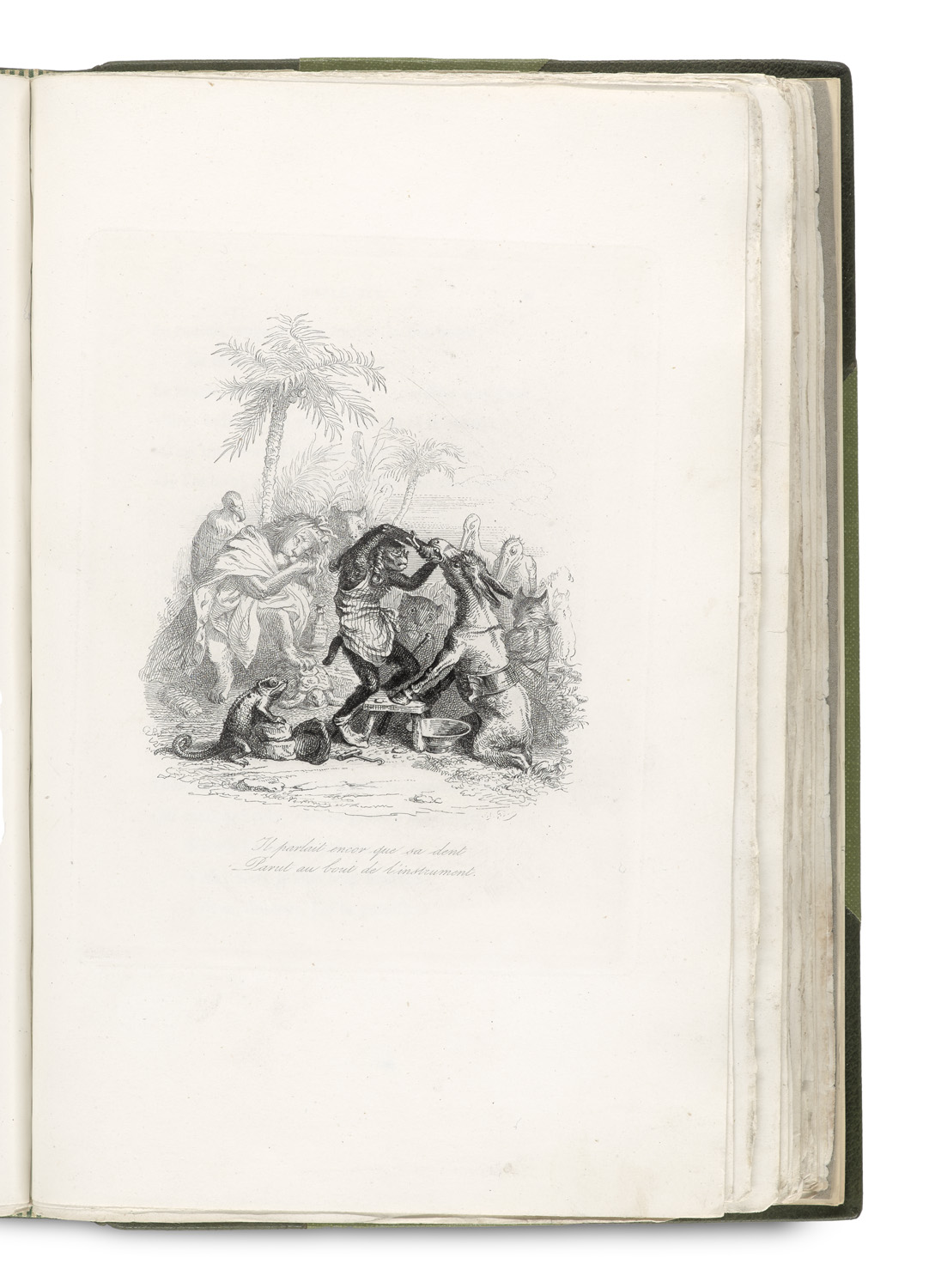 Fables. Illustrées de nouvelles eaux-fortes de Grandville. Mit 32 ganzs. Radierungen. Paris, J. Hetzel, 1847. 1 w. Bl., 163 S. 4°. Grünes HLdr. d. frühen 20. Jh. mit goldgepr. RSchild (illustr. OBrosch. mit eingebunden, diese fleckig).