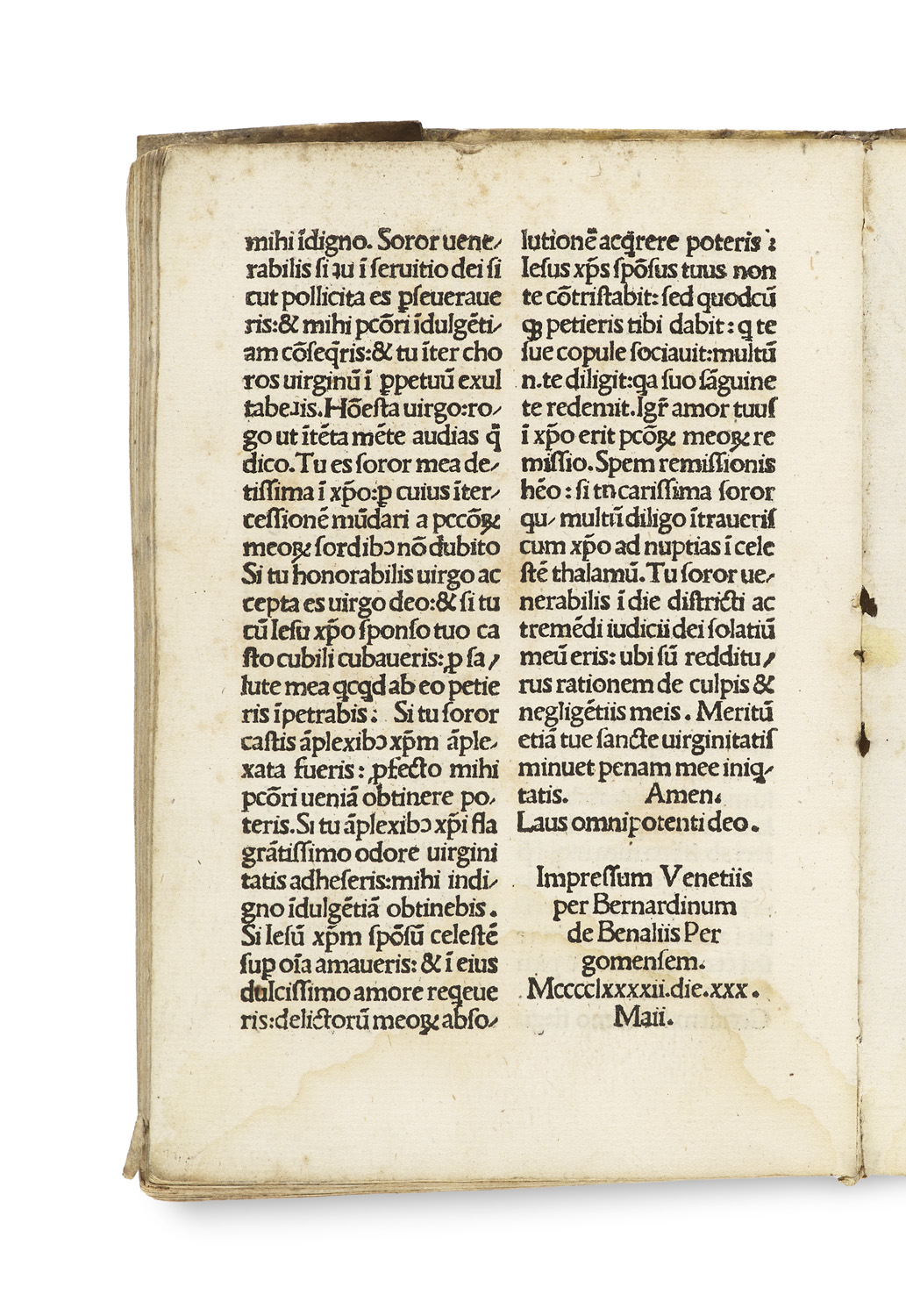 Prints before 1600, Bibles, Classics in Original Languages – Pseudo-Bernard's treatise on the proper modus vivendi of Christians, our copy from old French aristocratic provenance. - For references see above. - Second edition published printer Venetian printer Benalio, after the editio princeps of 1490. - The work is attributed to the French Cistercian and early scholastic Bernard of Clairvaux (1090-1153), but most likely originated from the pen of his fellow monk and compatriot Thomas de Beverly-Froidmont (c. 1150-1225). - Provenance: Counts of Achard (13th-18th century, Venaissin, southern France), with their coat of arms incorporating 3 helmets painted in black ink on the front cover. - Title page with two owner inscriptions from the 15th and 16th century respectively in brown and black ink. - Incorrect pagination: 'dii' instead of 'diii', "eiii" instead of 'eiiii'. - Fol. 1 has several wormholes in the centre, resulting in a minimal text loss on the verso, otherwise wormholes throughout the unprinted bottom margin. Top edge and all margins occasionally slightly soiled, with finger stains and foxing, slightly visible water marks at bottom margin. Overall, a solid incunabula with old aristocratic provenance.