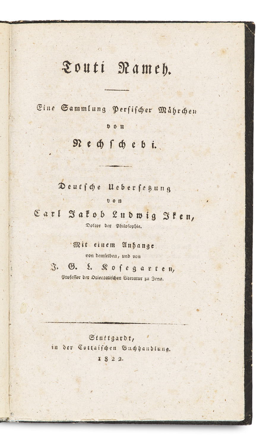 Touti Nameh. Eine Sammlung persischer Märchen. Deutsche Übers. von C. J. L. Iken, Anhang von J. G. C. Kosegarten. Stuttgart, Cotta, 1822. 323 S. Pp. d. Zt. mit RSchd.