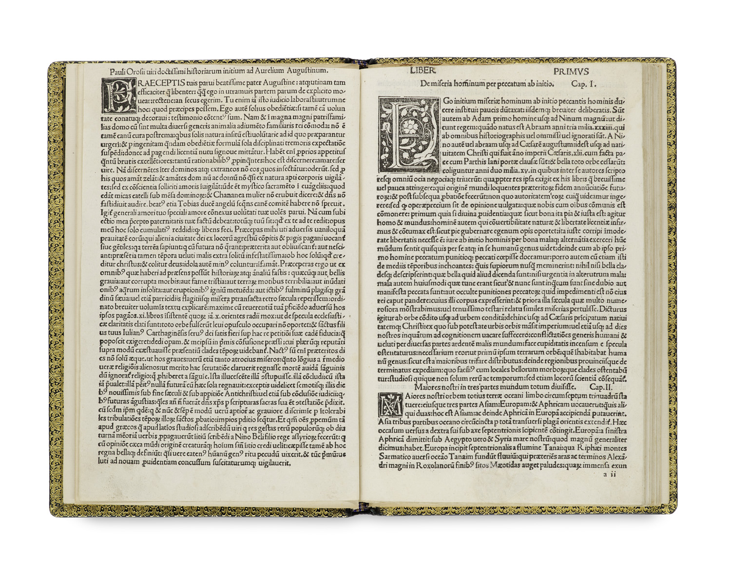 Prints before 1600, Bibles, Classics in Original Languages – With 3 nine-line and more than 100 three-line wood-cut initials incorporating figurative ornaments (plants, animals). - Last incunabula edition and in the same time fifth edition of a most important work by early Christian theologian and historian Paulus Orosius (c. 385 - c. 420), first printed by Johann Schüssler in Augsburg in 1471. A supplement to Augustine's "De Civitate Dei", undertaken at his request, the work is 'an outline of world history in 7 periods and organised according to 4 global empires from Adam to 417, to prove that pre-Christian humanity was even more afflicted by war and misery than the present, that Christianity was therefore innocent of the tribulations of the time'. (LThK VII, 784). Orosius' work was edited for the 1475 edition printed by Hermann Liechtenstein in Vicenza (Goff O-97) by the humanist Aenea Volpe, abbot of a monastery there, whose text was also adopted for the present edition. - - Binding minimally worn. Upper edge more heavily trimmed throughout, a few leaves therefore partly with slight loss of the upper margin of the title line print. First and last leaves slightly finger stained and soiled, a few leaves somewhat water stained, otherwise a well-preserved copy indeed. In a splendid full morocco with rich gilt fileting from the workshop of Joseph Zaehnsdorf, one of the most renowned bookbinders of his time.