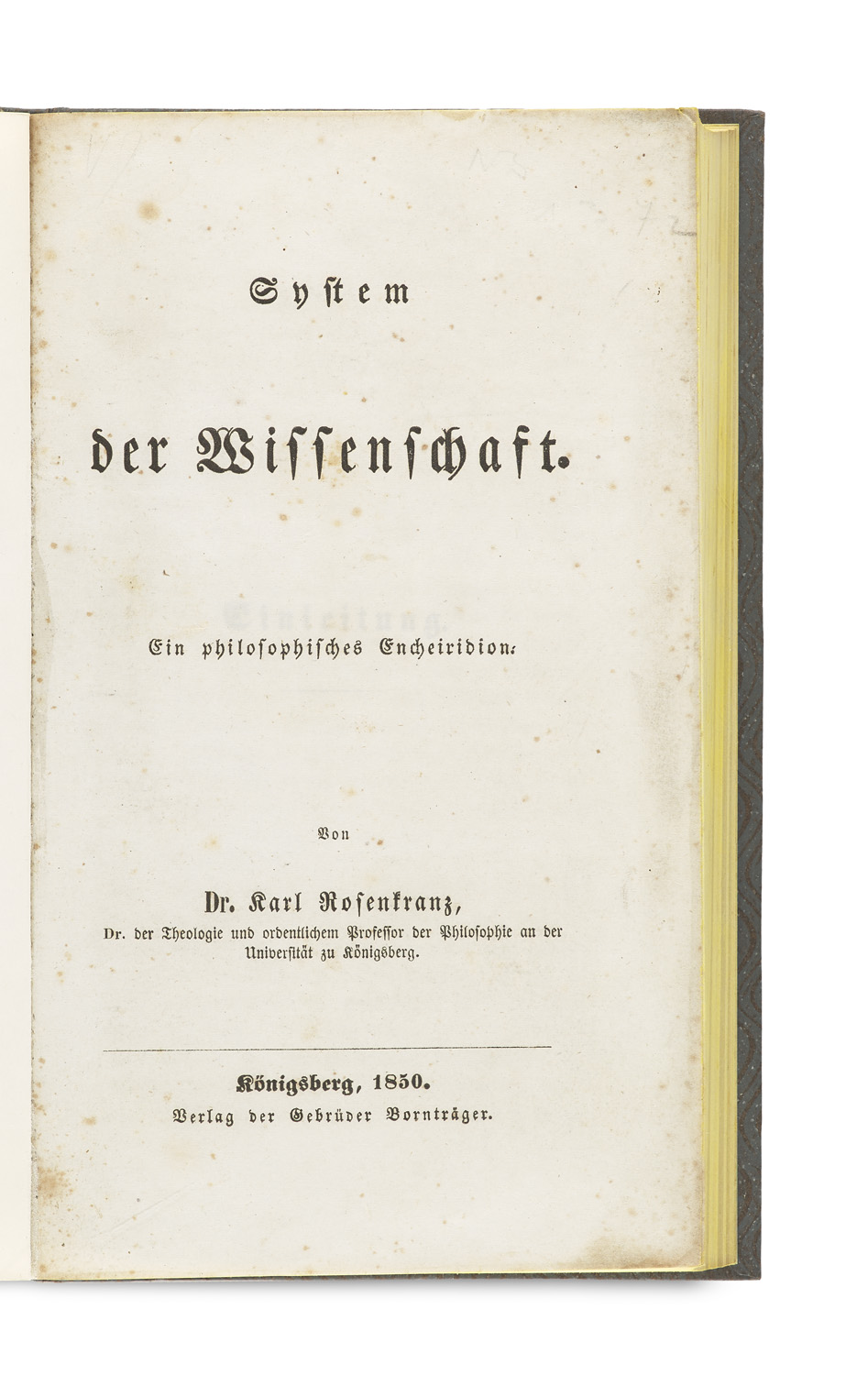 Literatur des 17. bis 19. Jahrhunderts – Erste Ausgabe von Rosenkranz' seltener Abhandlung. - Ziegenfuss, II, 373 - Selten, derzeit kein Exemplar im Handel, historisch auf Auktionen für uns nur in einem Exemplar nachweisbar. - Johann Karl Friedrich Rosenkranz (1805-79) war einer der wichtigsten Vertreter des gemäßigten Hegelianismus seiner Zeit und Hegels einziger zeitgenössischer Biograph (1844). In "System der Wissenschaft" erläutert er seine Wissenschaftsmethodik, die insbesondere für italienische Philosophen des 19. Jahrhunderts (Vera, Mariano, del Zio) sowie für William Torrey und die St. Louis School of Thought in den USA von Einfluss war. - Mitunter leicht stockfleckig, sonst wohlerhaltenes, breitrandiges Exemplar im schmucken modernen Einband.