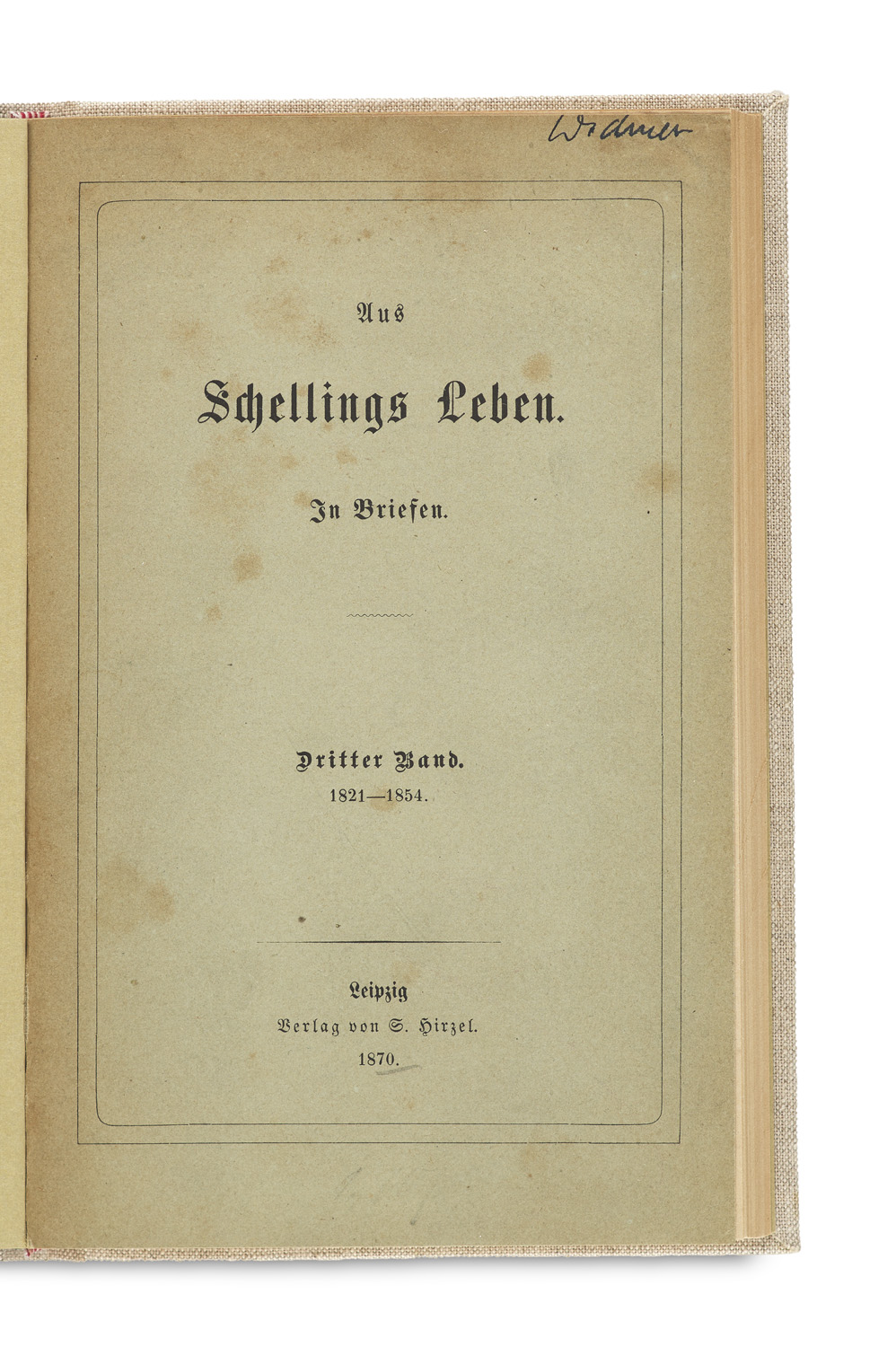 Aus Schellings Leben. In Briefen. 3 Bände. Hrsg. von G.L. Plitt. Leipzig, Hirzel, 1869. XI, 484, X, 446, IX, 254 Seiten. (Mod.) Leinwand mit RSchild (Orig.-Vorderumschläge mit eingebunden, diese teils leicht fleckig, 1x mit hinterlegtem Einriß, Name auf Umschlag).