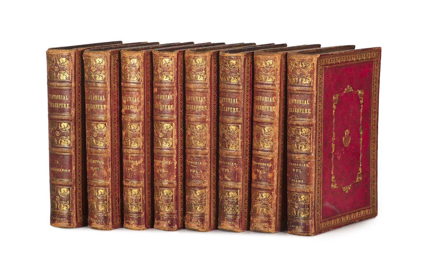 The Pictorial Edition of the Works of Shakspere. Edited by Charles Knight. 8 Bde. Mit zahlreichen gestochenen Illustrationen und je einem illustrierten Titelblatt. London, Charles Knight and Co., (1838-1842). Originales rotes Verlagsldr. mit golgepr. RTitel, RVergoldung und Verlagssignatur, ornamental goldgepr. Deckel mit Vignette, sowie Steh- und Innenkantenvergoldung (berieben und bestoßen, Kapitale stärker bestoßen, leicht fleckig).