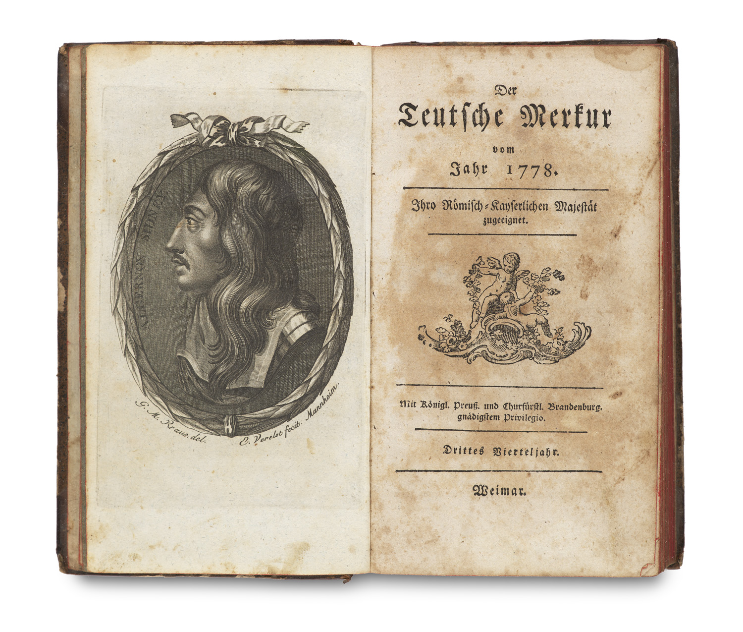 Literature of 17th to 19th Century – Vol. 21-24, 4 parts (complete year) in 4 vols. With 1 eng. Frontispiece. Cont. half leather bindings with mounted label a. gilt spine (slightly scuffed, rubbed a. bumped, vol 23 the label o. spine missing, capitals with small defects). - The "Teutsche Merkur" was published from 1773 to 1789 by Christoph Martin Wieland as a literary journal in Weimar in 12 issues per year. The journal was initially published quarterly, then monthly from 1775. - The original wrappers each bound in. - Mostly without the engraved frontispieces. Frontispieces, somewhat browned and foxed throughout. Overall well preserved.
