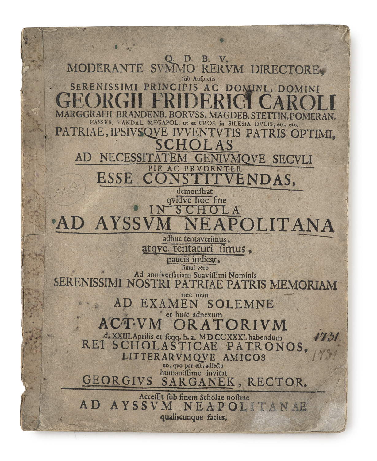 Scholas ad necessitatem qeniumque seculi pie ac prudenter esse constituendas demonstrat (...) humanissime invitat Georgius Sargenek, Rector. (1731). 20 S. 8°. OBroschur (fleckig, mit Knicken und Einrissen an den Rändern).