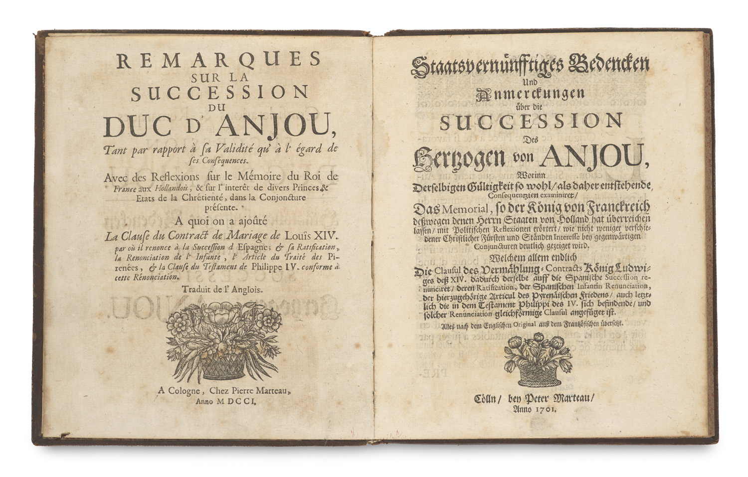 Remarques sur la Succession du Duc d'Anjou, Tant par rapport à sa Validité qu'à l'égard de ses Conséquences... Traduit de l'Anglois. Staatsvernünfftiges Bedenken und Anmerckungen über die Succession des Herzogen von Anjou... Alles nach dem Englischen Original aus dem Französischen übersetzt. Köln, Marteau, 1701. 119 S. 8°. Ldr. d. Zt. (stark berieben und beschabt, Fehlstellen im Bezug).