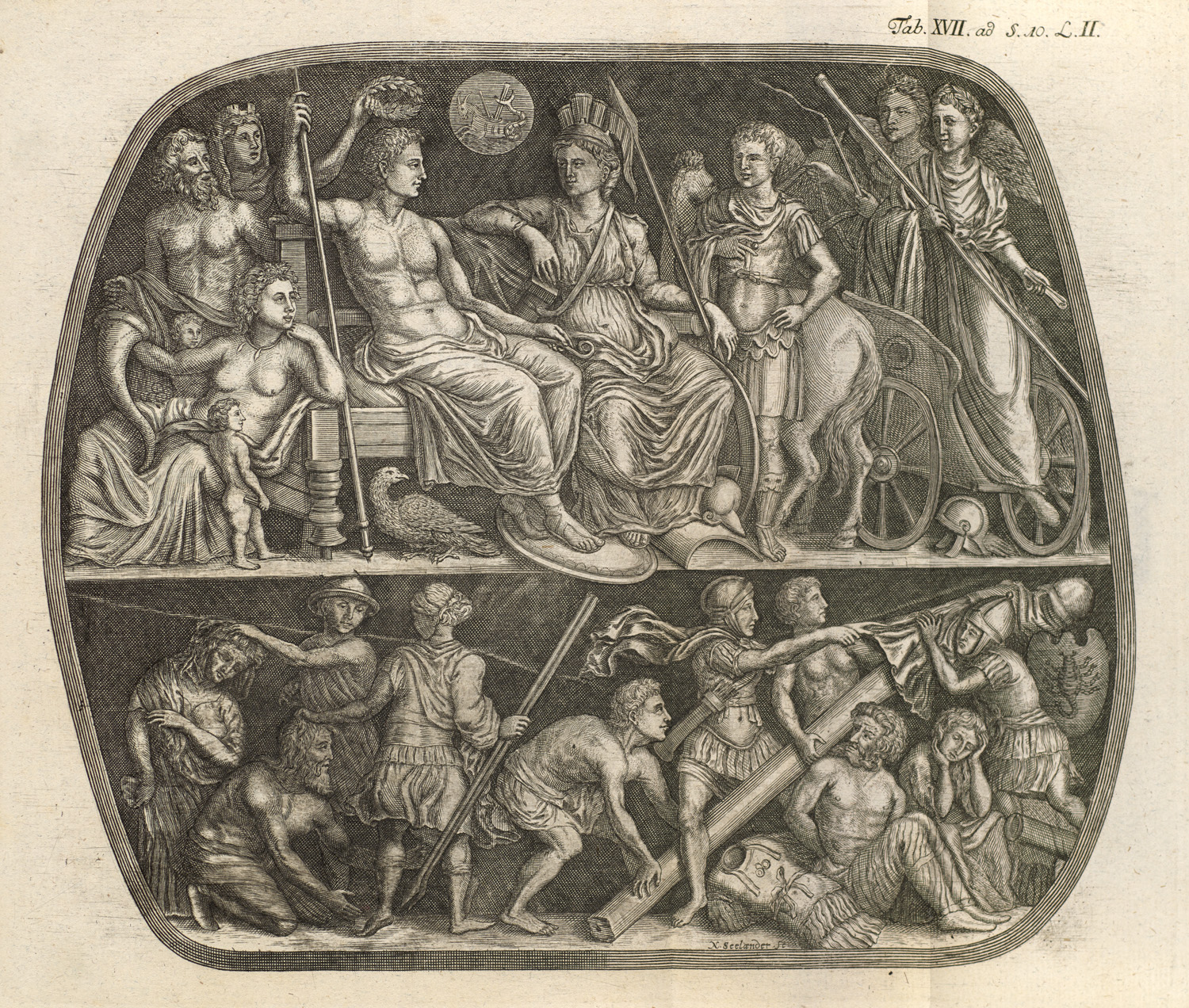 De origine germanorum eorumque vetustissimis coloniis, migrationibus ac rebus gestis. Libri duo. Mit gestochener Titelvignette, 19 zumeist gefaltetete gestochene Tafeln, 2 Kupferstichkarten und 4 Textkupfern. Göttingen, Schmid, 1750. XXXXVIII S., 2 Bll., 448 S. Gr.-8°. Pp. d. Zt. (etwas fleckig und berieben).
