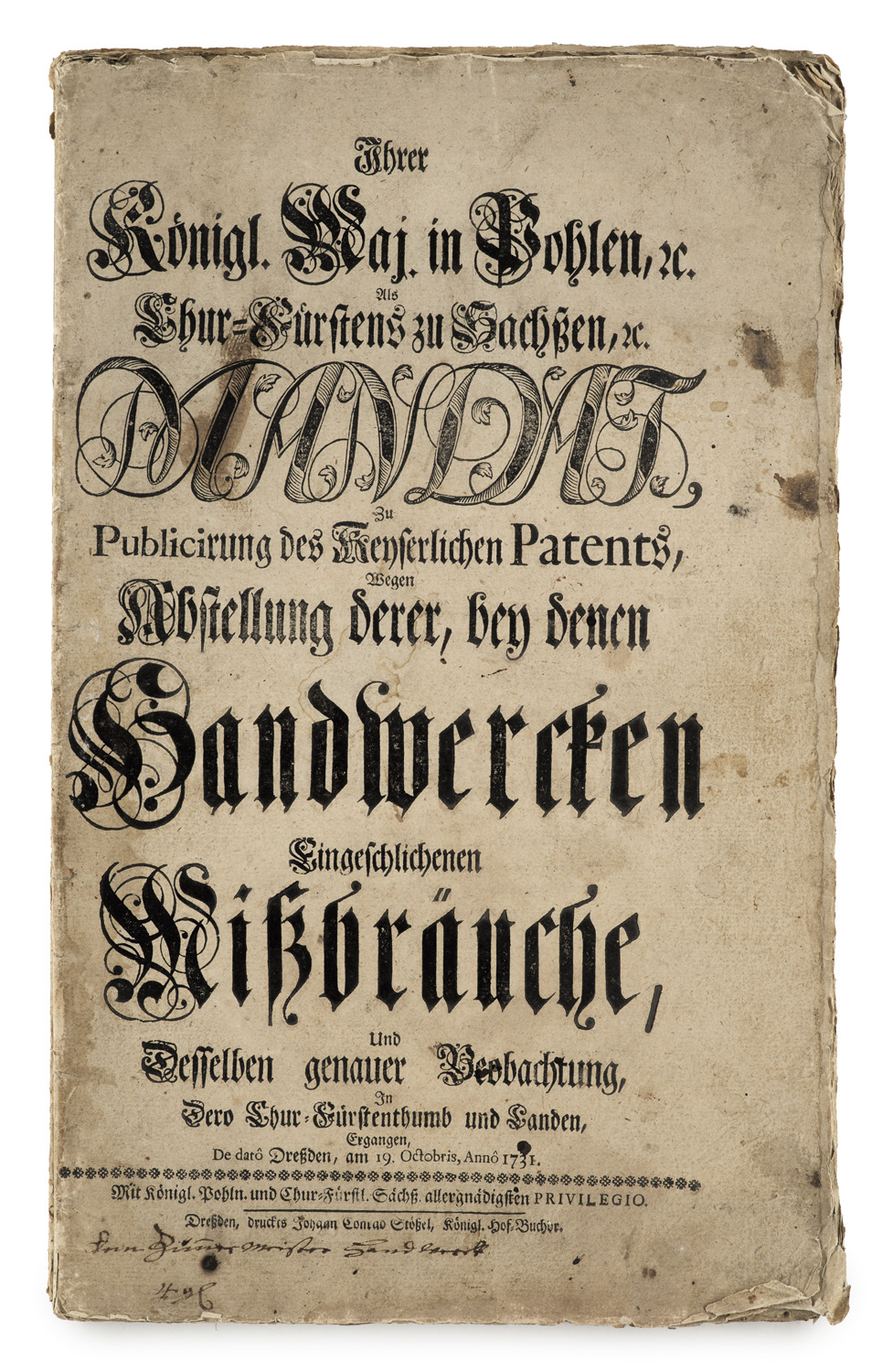 Sammlung von 1 Patent zum Handwerk, 1 Edikt zur Feuervermeidung sowie 4 Verordnungen zur Pest und zur Einfuhr von Waren. 1710-1731. Fol. Unbeschnittene Bütten-Bll.